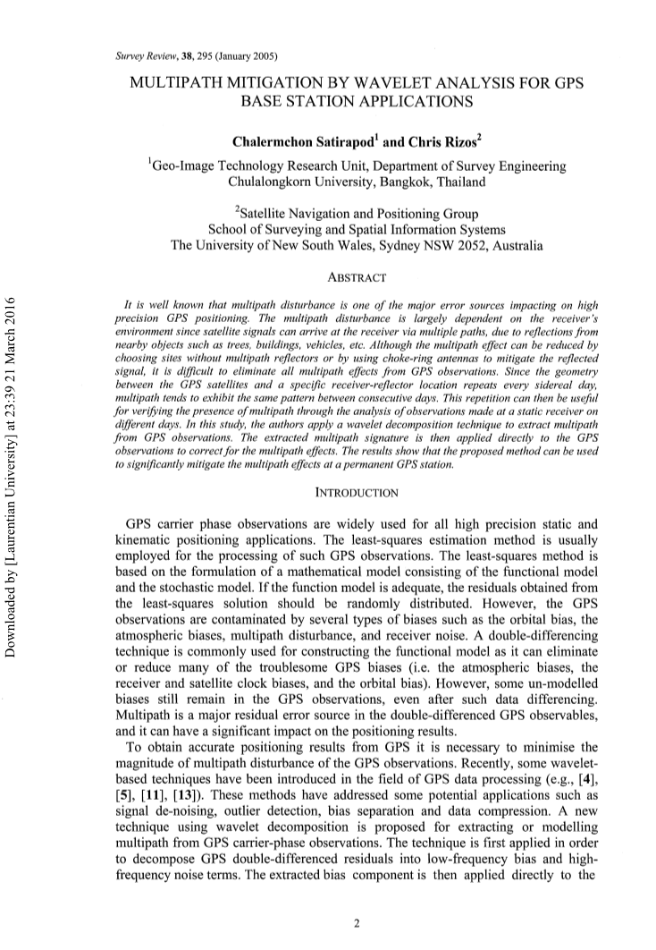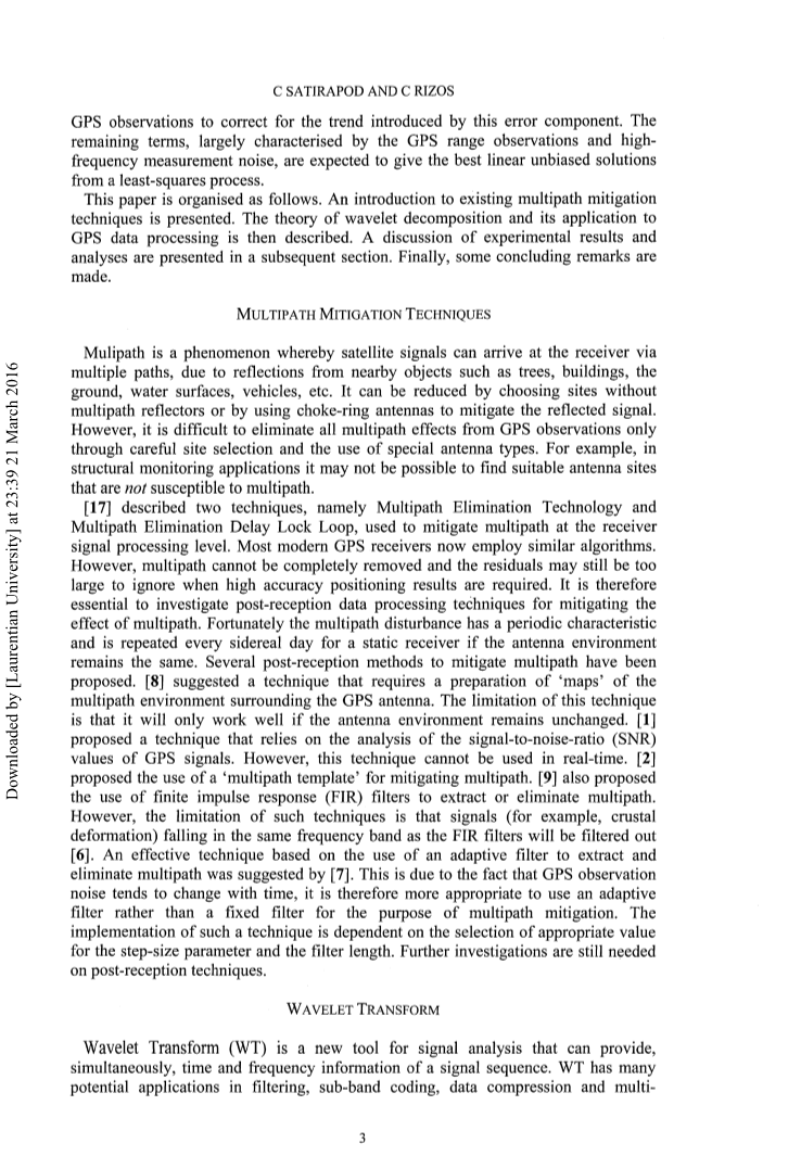 众所周知,多径干扰是影响高精度GPS定位的主要误差源之一。多径干扰在很大程度上取决于接收机的环境,因为卫星信号可以通过多条路径到达接收机,这是由于附近的物体如树木、建筑物、车辆等的反射。尽管可以通过选择没有多径反射器的地点或使用扼流圈天线来减轻反射信号来减少多径效应,但是很难消除GPS观测中的所有多径效应。由于GPS卫星和一个特定的接收器-反射器位置之间的几何形状在每个恒星日都会重复,所以多径在连续几天之间往往表现出相同的模式。这种重复可以通过分析一个静态接收器在不同日子里的观测结果来验证多路径的存在。在这项研究中,作者应用小波分解技术从GPS观测中提取多径。然后将提取的多径特征直接应用于GPS观测,以校正多径效应。结果表明,所提出的方法可以用来大大减轻永久性GPS站的多径效应。