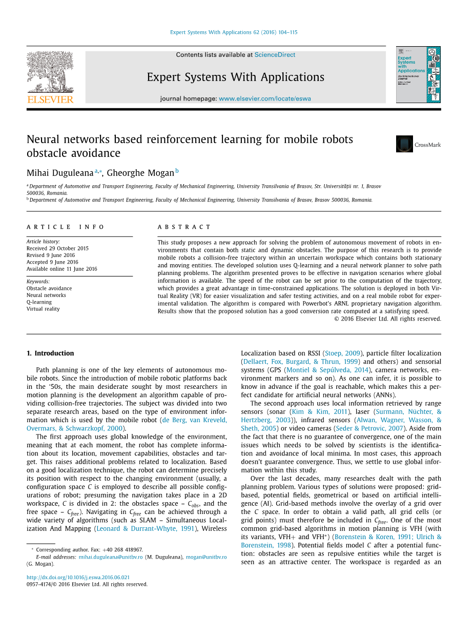 其中Q是解决方案的集合,S是状态的集合,A是行动的集合。如果移动机器人达到了目标,那么成本,或者更好地说,无碰撞轨迹的奖励是给定的。换句话说,建议的解决方案从工作空间中对每个状态、行动和结果进行采样,作为一个基本的概率分布,有助于计算奖励参数。为了快速收敛,该解决方案进一步使用了前馈神经网络。因此,拟议的解决方案通常会在最初的几个阶段找到一个无碰撞的轨迹。该运动规划器在VR中进行初始测试和有效的可视化,在达到满意的效果后,在一个真实的移动机器人上实现:移动机器人的PowerBot(“PowerBot web-site”, 2015)