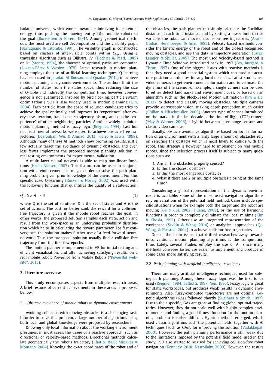 在过去的几十年里,许多研究涉及到路径规划问题。提出了各种类型的解决方案:基于网格、势场、几何学或基于人工智能(AI)。基于网格的方法包括在空间上覆盖一个网格。为了获得有效的路径,所有的网格单元(或网格点)都必须包含在空间中。运动规划中最常见的一个 运动规划中最常见的基于网格的算法是(及其变体,和)(Borenstein amp; Koren, 1991; Ulrich amp; Borenstein, 1998)。势场以势能函数的方式对空间进行建模:障碍物被视为排斥性实体,而目标则被视为有吸引力的中心。工作空间被视为一个孤立的宇宙,它致力于使其势能最小化,从而将移动实体(移动机器人)推向目标(Borenstein amp; Koren, 1991)。在几何学方法中,使用最多的是单元格分解和可见度图(Barraquand amp; Latombe, 1991)。可见度图的构建是基于内可视点之间的聚类。使用Dijkstra、(Dechter amp; Pearl, 1985)或(Stentz, 1994)等遍历算法,计算出最短或最优路径(Lozano-Peacute;rez amp; Wesley, 1979)。运动规划的最新研究采用了人工学习技术。Jaradat, Al-Rousan, and Quadan (2011)使用Q-learning来实现动态环境下的运动规划。作者限制了状态空间中的状态数量,从而减少了Q表面的大小,间接地减少了计算时间;但是,收敛性并没有保证。受鸟群的启发,粒子群优化(PSO)也被广泛用于运动规划中(Qin, 2004)。来自候选解决方案空间的每个粒子都试图以最佳方式实现目标,并在每次新的迭代后根据其轨迹历史和其他邻近粒子的 '经验 ',改进其 '经验'。另一种被广泛利用的运动规划方法是模糊逻辑(Reignier, 1994)。最后但并非最不重要的是,神经网络被用来实现无障碍的轨迹(Dezfoulian, Wu, amp; Ahmad, 2013; Fierro amp; Lewis, 1998)。尽管这些人工智能方法中有许多显示出有希望的结果,但只有少数方法真正以避开动态障碍物为目标,甚至更少的方法在真正的测试环境中实施所提出的运动规划解决方案以进行实验验证。