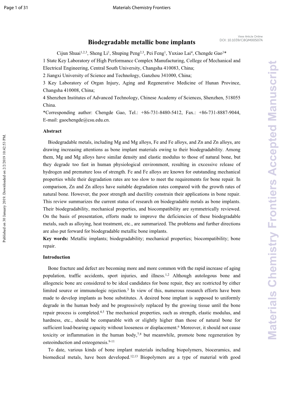 本文系统地介绍了生物可生物降解金属的特性。从生物降解性、力学性能和生物相容性等方面评价了它们对骨植入物的应用潜力。此外,还对如何调节其生物降解性和力学性能进行了总结和讨论。并展望了生物可降解金属骨植入物的未来发展趋势。