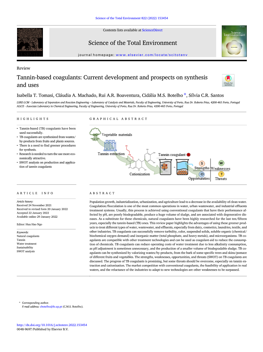 人口增长、工业化、城市化和农业导致清洁水的供应减少。混凝/絮凝是水、城市废水和工业废水处理系统中最常见的操作之一。通常,这一过程是使用传统的絮凝剂实现的,这些絮凝剂的性能受pH影响,生物降解不良,产生大量污泥,并与退行性疾病有关。作为这些化学物质的替代品,天然混凝剂在过去的10/15年里得到了广泛的研究,特别是单宁基(TB)。这篇综述论文强调了使用这些绿色产品来处理不同类型的水、废水和废水的优点,特别是来自乳制品、化妆品、洗衣店、纺织和其他行业的废水。单宁基混凝剂可以成功地去除浊度、颜色、悬浮固体、可溶性有机物质(化学/生化需氧量)和无机物质(总磷酸盐和重金属)和微生物。单宁基混凝剂与其他治疗技术兼容,可作为助凝剂使用,以减少化学品的消耗。单宁基混凝剂可以降低水处理的操作成本,因为碱度消耗较少,因为pH调整有时是不必要的,并且生产更小体积的生物可降解污泥。单宁基混凝剂可以通过稳定废物/副产品,从一些特定树木的树皮和不同水果和蔬菜的皮/蛋渣中合成。本文讨论了单宁基混凝剂的优势、劣势、机会和威胁(SWOT)。单宁基混凝剂的进展是有希望的,但应该克服一些威胁,特别是在单宁提取和阳离子化方面。与传统混凝剂的市场竞争、在实际水域应用的可行性以及行业不愿适应新技术,都是其他有待超越的弱点。