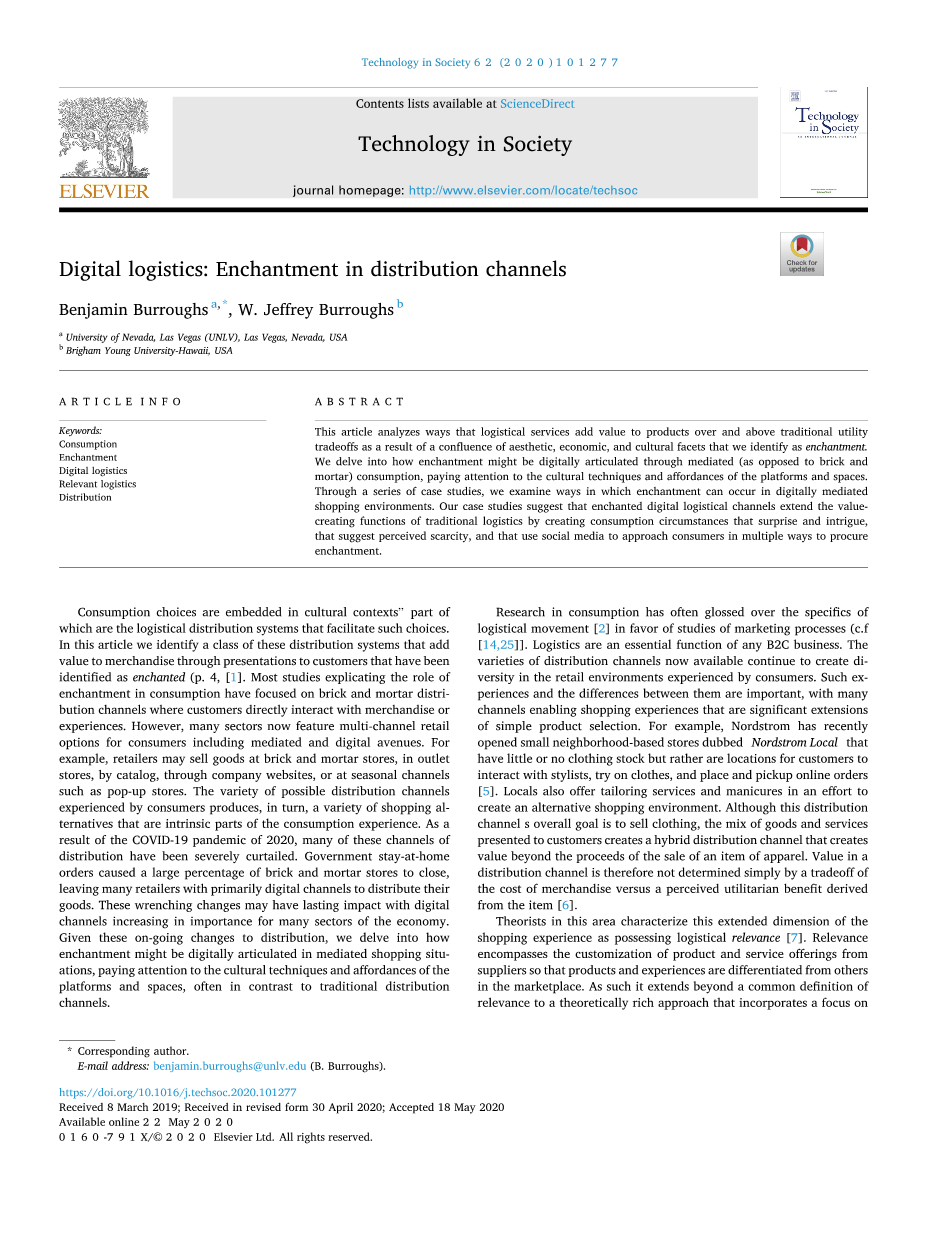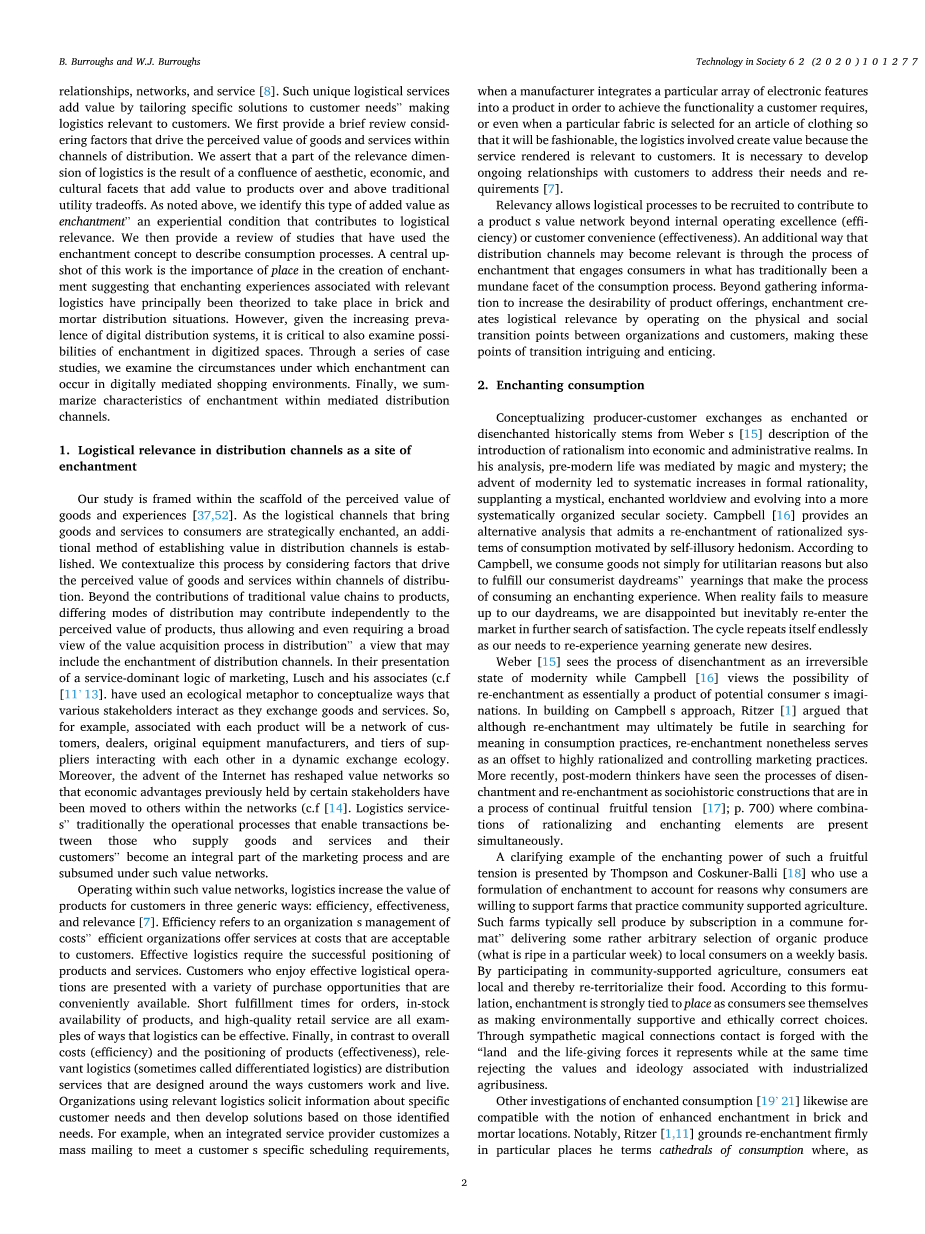 消费的研究往往掩盖了物流流动[2]的细节,而支持营销过程的研究 . 物流是任何B2C业务的基本功能。目前可用的各种分销渠道继续在消费者所体验到的零售环境中创造多样性。这些体验和它们之间的差异是很重要的,有许多渠道使购物体验,是简单产品选择的重要延伸。例如,诺德斯特龙最近开了一家名为“诺德斯特龙本地”的小型社区商店,这些商店很少或没有服装库存,而是供顾客与造型师互动、试穿衣服、在网上下单和购买[5]的地方。当地人还提供裁剪服务和美甲,以努力创造一个替代 的购物环境。虽然这个分销渠道的总体目标是销售服装,但向客户提供的商品和服务的混合创造了一个混合的分销渠道,创造了超出服装销售收益的价值。因此,分销渠道中的价值并不是简单地由商品成本与来自商品[6]的感知 功利利益的权衡所决定的,这一领域的理论家将购物体验的扩展维度描述为具有后勤相关性的[7]。相关性包括从供应商那里定制产品和服务,从而使产品和体验与市场上的其他产品有所不同。因此,它超越了一个常见的关联定义,延伸到一个理论上丰富的方法。关系、网络和服务[8]。这种独特的物流服务通过根据客户需求定制特定的解决方案来增加价值,使物流与客户相关。我们首先简要回顾考虑驱动商品 和服务的感知价值的因素。我们断言,物流相关性维度的一部分是美学、经济和文化方面融合的结果,在传统的效用权衡之外,为产品增加了价值。如 上所述,我们将这种类型的附加价值定义为魅力——一种有助于后勤相关性 的经验条件。然后,我们提供了一个已经使用迷人的概念来描述消费过程的 研究的回顾。这项工作的一个中心结果是地点在创造魅力的重要性,表明与 相关物流相关的迷人经验主要被理论上发生在砖和砂浆分配的情况下。然而,考虑到数字分发系统的日益普及,研究在数字化空间中产生的魅力的可能 性也是至关重要的。通过一系列的案例研究,我们研究了在数字中介的购物 环境中,魅力可以发生的环境。最后,我们总结了在中介分布通道内的魅力特征。
