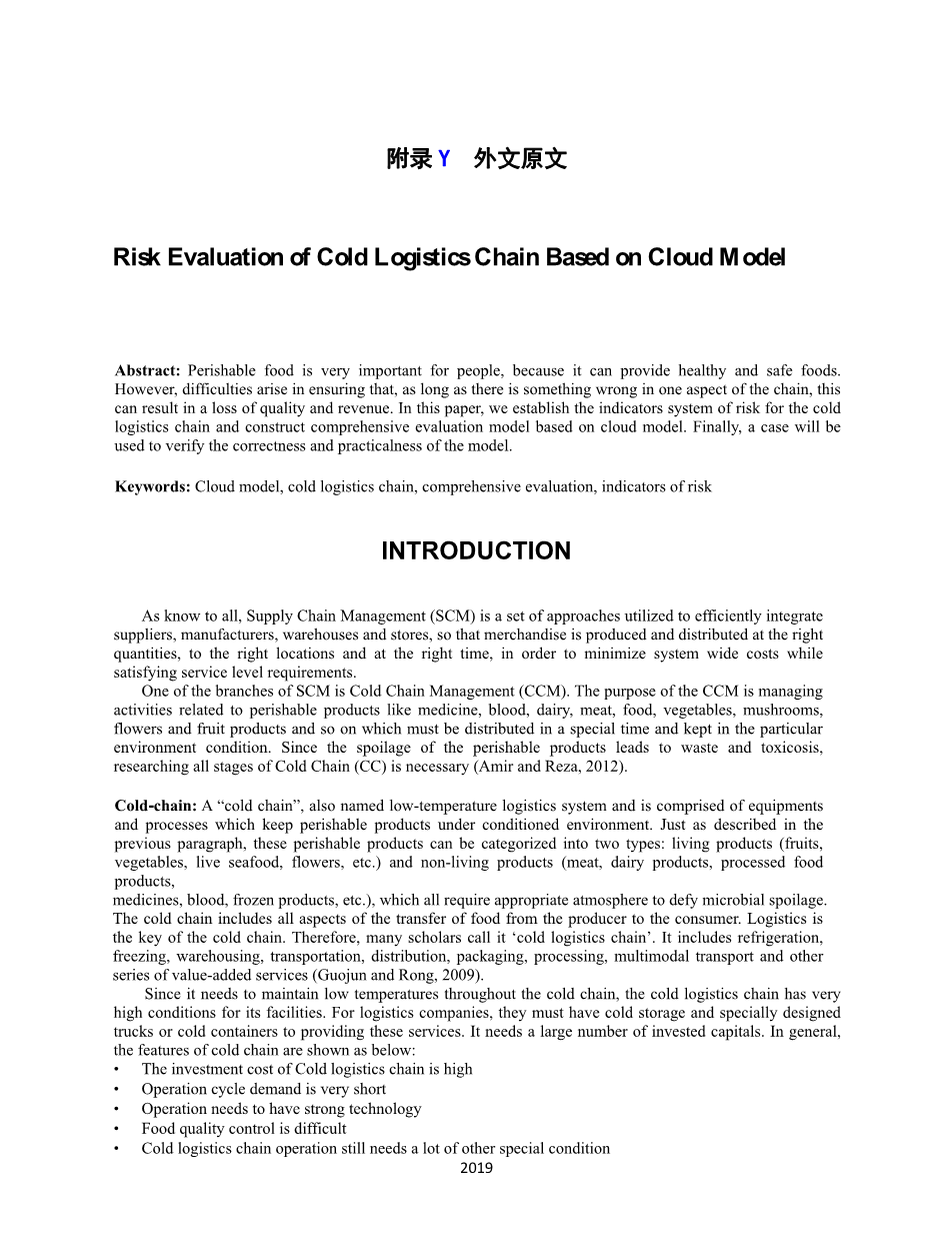 研究目的:构建冷物流链风险评价指标体系,引入云模型理论,建立云模型综合评价模型。最后通过一个案例验证了模型的正确性和实用性。