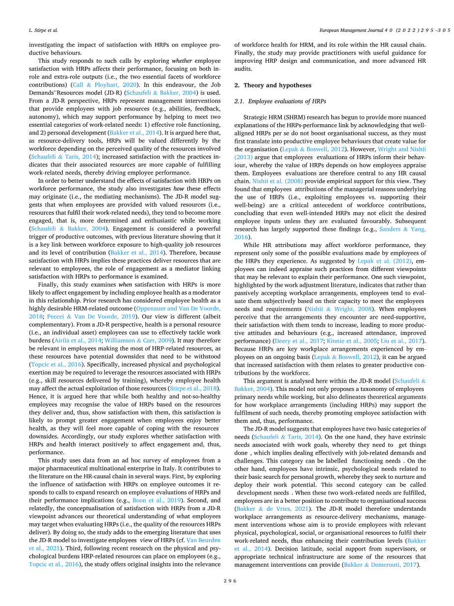 这项研究使用了来自意大利一家大型制药跨国企业员工的特别调查数据。它在几个方面促进了关于hr-因果链的文献。首先,通过探索对hrp的满意度对员工结果的影响,它响应了扩大对员工对hrp的评估及其绩效影响的研究的呼吁(例如,Boon等人,2019年)。其次,与之相关的是,从JD-R的角度对hrp的满意度的概念化推进了我们对员工在评估hrp时(即hrp提供的资源的质量)的目标的理论理解。通过这样做,该研究增加了使用JD-R模型来调查员工对hrp的观点的新兴文献(cf。VanBeurden等人,2021年)。第三,在最近对HRP相关资源可能给员工造成的生理和心理负担的研究之后(例如,Topcic等人,2016年),该研究提供了对相关性的原始见解HRM及其在人力资源因果链中的作用。最后,该研究可能为从业人员改进HRP设计和沟通提供有用的指导,以及更先进的人力资源审计。