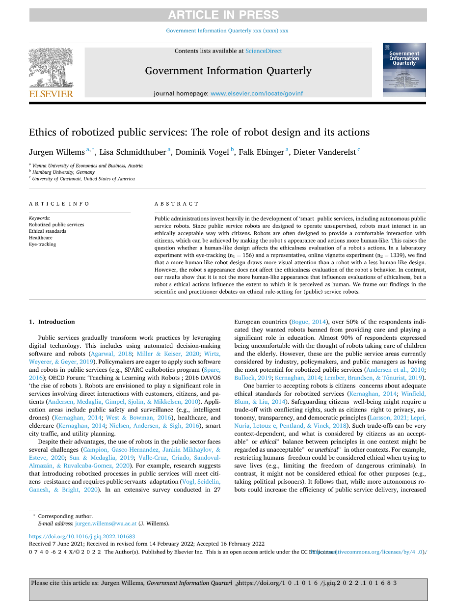 摘要: 公共行政部门在开发“智能”公共服务方面投入了大量资金,包括自主的公共服务机器人。由于公共服务机器人被设计成可以在无人监督的情况下操作,因此机器人必须以一种道德上可接受的方式与公民进行互动。设计机器人通常是为了提供公民舒适的互动,这可以通过使机器人的外观和动作更像人来实现。这就提出了一个问题,即类似人类设计是否会影响对机器人行为的伦理评估。在一个带有眼球追踪技术的实验室实验中(n1=156)和一个具有代表性的在线小插图实验(n2=1339)中,我们发现更像人的机器人设计比更少类人设计的机器人吸引的视觉关注更多。