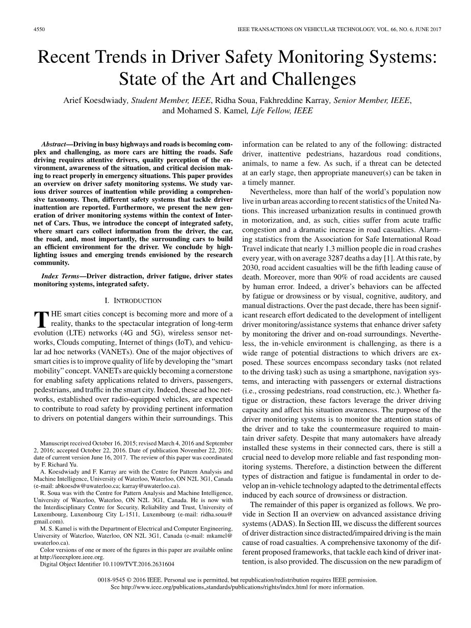 摘要:随着越来越多的汽车上路,在繁忙的高速公路和公路上驾驶变得越来越复杂和具有挑战性。安全驾驶要求驾驶员注意安全,对环境有质量意识,了解情况,并做出关键决策,以便在紧急情况下做出适当反应。本文对驾驶员安全监控系统进行了综述。我们研究了各种不注意的驱动源,同时提供了一个全面的分类。然后,报告了不同的安全系统解决司机的疏忽。此外,我们还在车联网的背景下介绍了新一代的驾驶员监控系统。因此,我们引入了综合安全的概念,智能汽车从司机、汽车、道路,以及最重要的是,周围的汽车收集信息,为司机构建一个高效的环境。最后,我们强调了研究界设想的问题和新趋势。