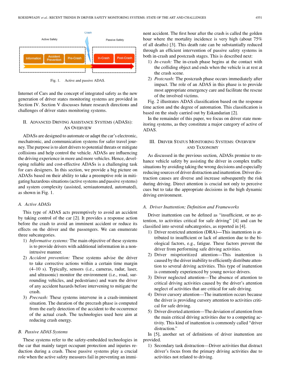 本文的其余部分组织如下。我们在第二节概述了高级辅助驾驶系统(ADAS)。在第三节中,我们讨论驾驶员分心的不同来源,因为分心/受损驾驶是道路伤亡的主要原因。一个全面的分类,不同的提议框架,以应对各种类型的驱动注意力,也提供了关于新范式的讨论。第四节讨论了车联网的新范式和作为新一代驾驶员状态监测系统的综合安全概念。第五节讨论了驾驶员状态监测系统未来的研究方向和挑战。