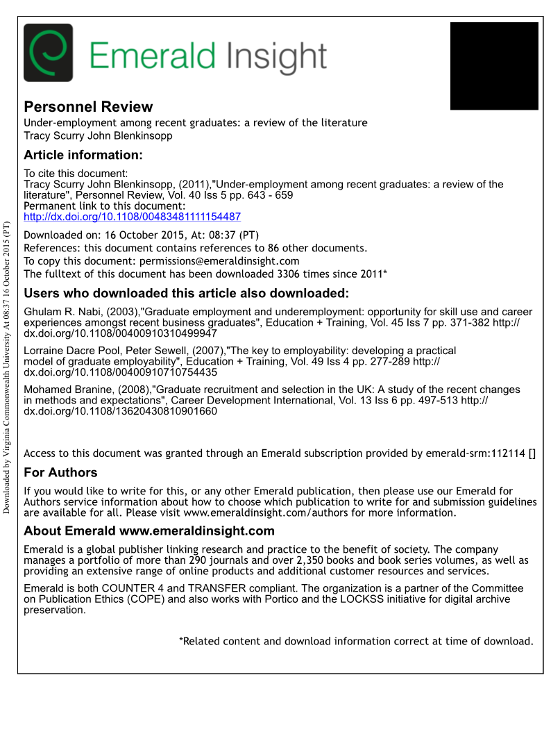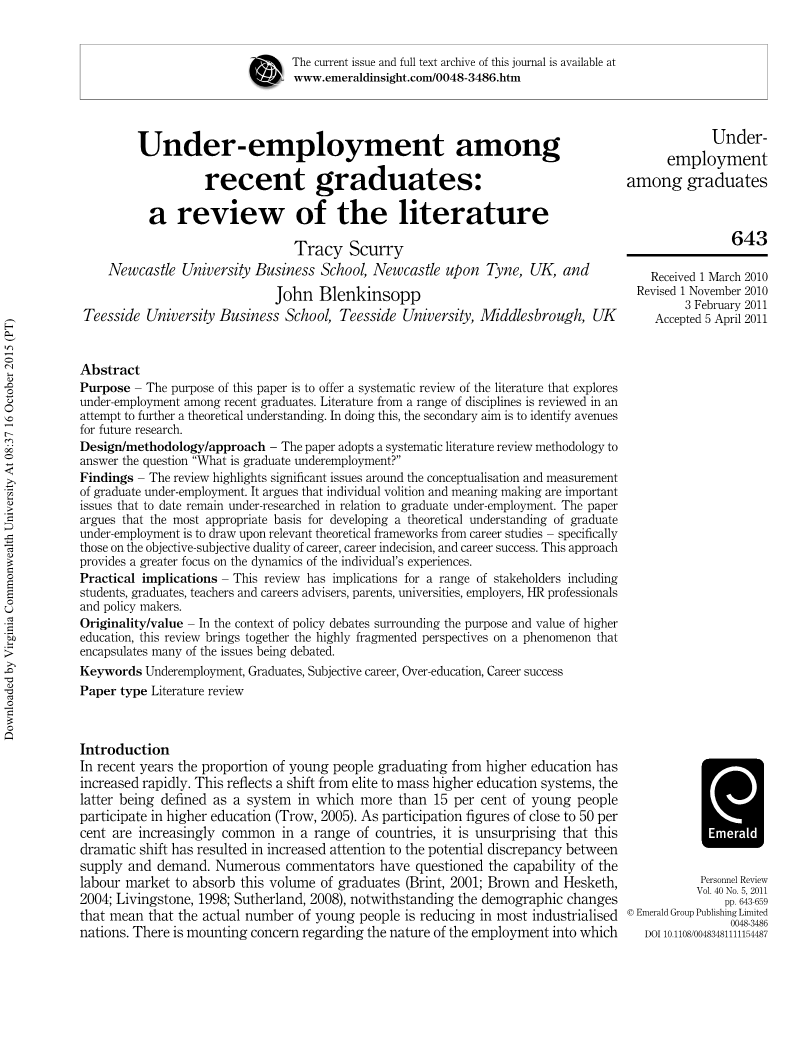 因此,本文回顾了关于就业不足的文献,特别关注最近的毕业生,试图评估和探讨不同文献中的定义和概念的范围。我们的方法是通过管理领域内不断增长的系统文献综述得出的。这种方法代表了从一系列学科和观点来研究主题的聚合和整合知识的有效方法。Denyer和Tranfield建议系统评价应该旨在回答一个明确规定的问题,而不仅仅是概述一个特定主题的工作。我们在本文中遵循这一建议,将重点放在回答“什么是毕业生就业不足”的问题上。由于纪律分裂和定义性辩论,这是一个可能乍一看比较复杂的任务,但是尝试回答这个问题将为这一现象提供真正多学科的方向。
