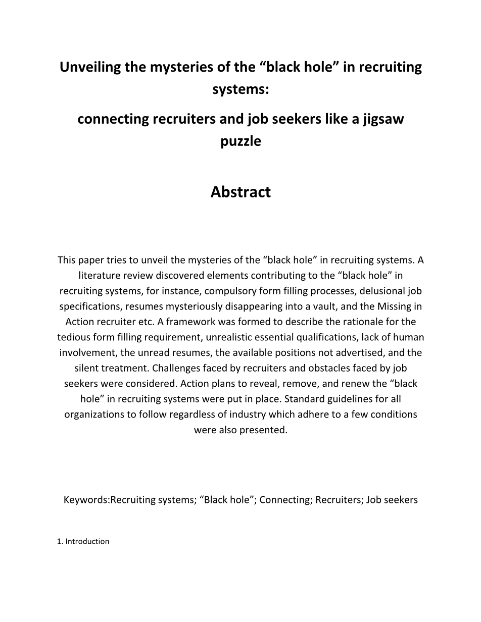 “Black hole” in recruiting systems appear when recruiters of available positions and job seekers are unaware of each others existence when they use these systems to find each other, hoping to have a quality talent acquisition experience . This demonstrated a serious mismatch between people/organizations looking to fill available positions and people looking to land on available positions. This may lead to wasted time and effort on both sides of the game. Thus, identifying ways to fill the “black hole” by suggesting how to connect recruiters and job seekers becomes necessary. This paper investigates the mysteries of the “black hole” in recruiting systems by connecting recruiters and job seekers like a jigsaw puzzle. The aim of this paper is to match recruiters and job seekers through identifying elements that contribute to the “black hole” in recruiting systems, develop action plans to remove the “black hole” by considering the issues faced by both recruiters and job seekers, and recommend standard guidelines for all organizations to follow regardless of industry. A framework to explain the rationale for the “black hole” in recruiting systems was formed and described. The action plans proposed in this presentation will make the recruiting process more efficient and effective. The standard guidelines for all organizations to follow regardless of industry will simplify the lengthy and bottomless recruitment process.
