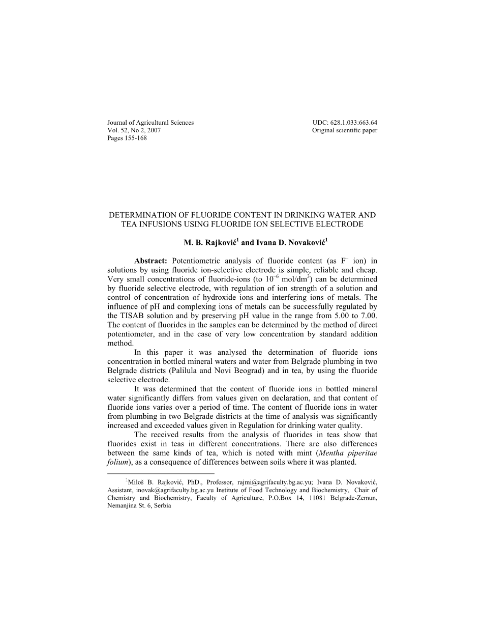 在本文中,分析了氟化物选择性电极用于测定在两个Beograd地区(Palilula和Novi Beograd)的供水系统和不同茶溶液,瓶装矿泉水和饮用水的样品中的氟离子含量的用途。 通过使用离子选择性电极,可以以高于0.1mg/dm3的浓度测定氟离子含量。 离子选择电极用于确定氟离子的优点在于更宽的线性范围,响应时间短,样品的非破坏性,并且没有样品的污染。