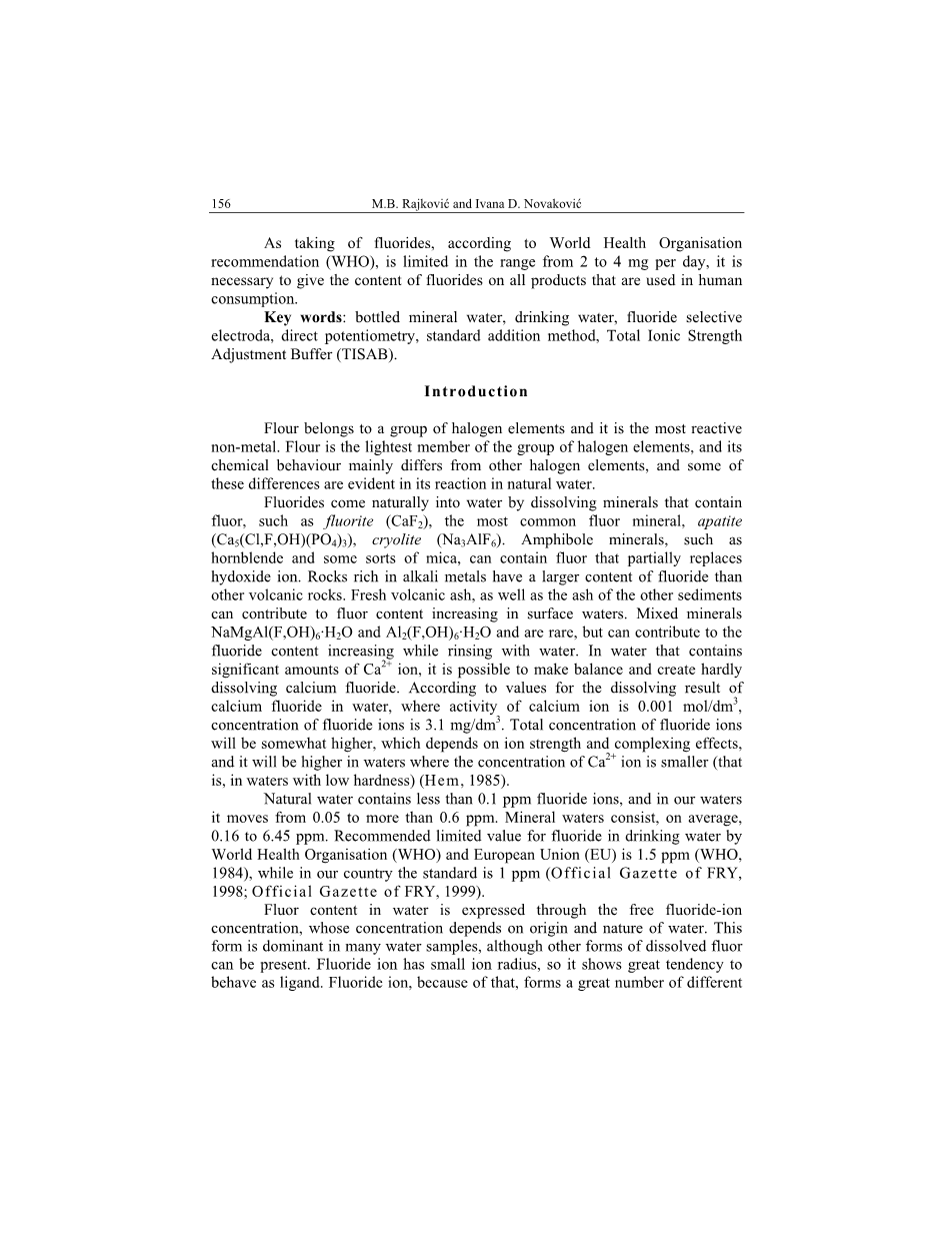 天然水含有小于0.1 ppm的氟离子,在我们的水中它从0.05变为大于0.6ppm。矿物水中平均含有0.16至6.45ppm的氟离子。世界卫生组织(WHO)和欧盟(EU)对饮用水氟化物的推荐限值为1.5 ppm(WHO,1984),而我国的标准是1 ppm(Official Gazette of FRY, 1998; Official Gazette of FRY, 1999).