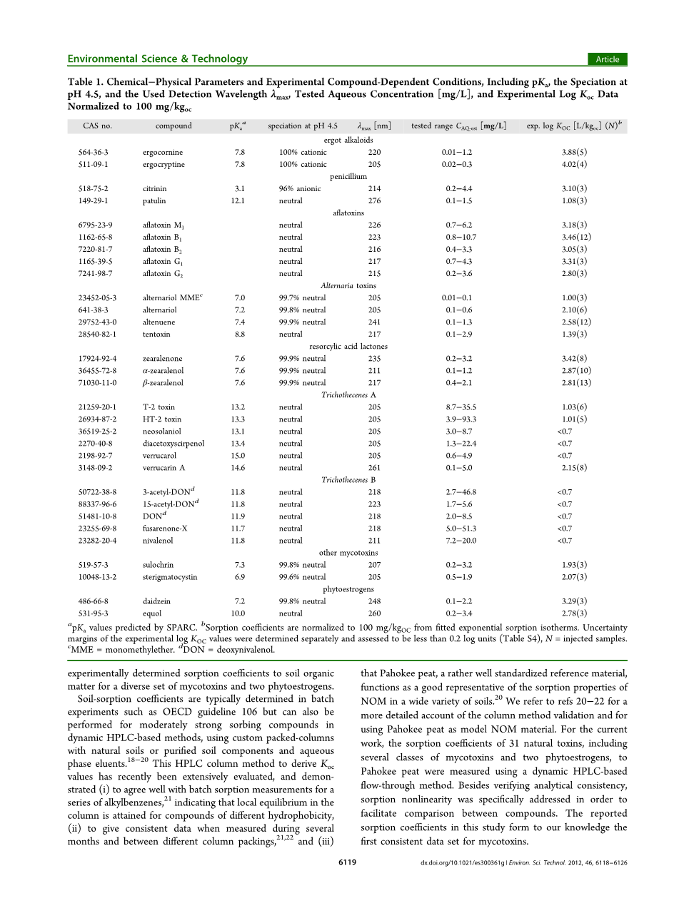 吸烟系数通常在批次实验中确定,如经合组织指南106,但也可以在基于动态HPLC的方法中对中等强度的吸附化合物进行,使用具有天然土壤或纯化的土壤组分和水相洗脱剂的定制填充柱。这种用于得到Koc值的HPLC柱方法最近被广泛评估,并且被认为是同意的很好地与一系列烷基苯的批次吸附测量表明,对于不同的疏水性的化合物,在柱中获得局部平衡,以便在几个月内和在不同的柱填料之间得到一致的数据,以及Pahokee泥炭,相当好标准参考材料,作为吸附支柱的良好代表NOM在各种土壤中的特性。我们参考参考文献20-22更详细的列方法验证和使用Pahokee泥炭作为NOM材料。对于目前的工作,使用基于动态的基于HPLC的流通方法测量了31种天然毒素(包括几种霉菌毒素和两种植物雌激素)对Pahokee泥炭的吸附系数。除了验证分析一致性之外,还特别处理了吸附非线性,以便于化合物之间的比较。本研究报告的吸附系数使我们知道第一个一致的真菌毒素数据集。