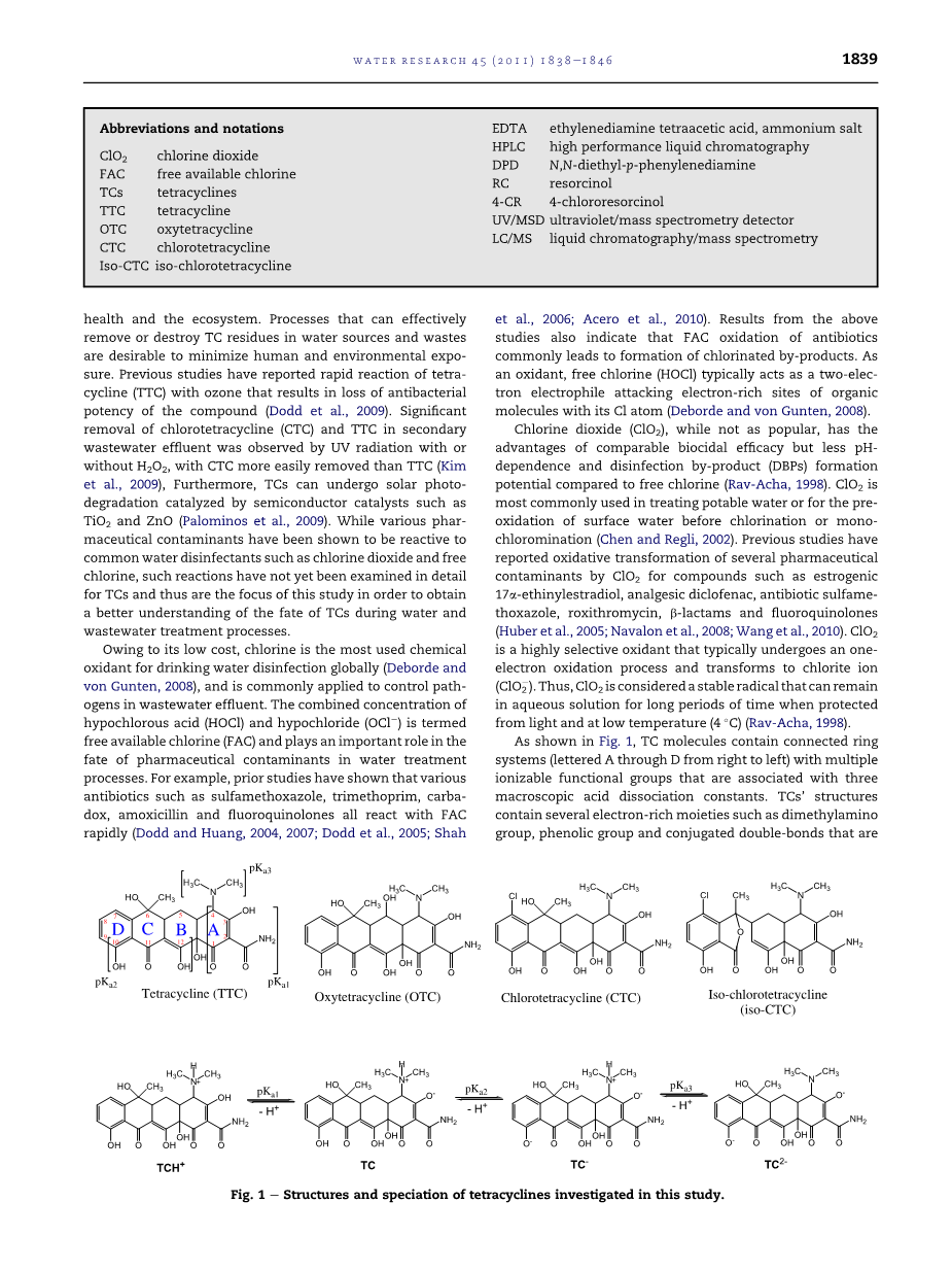 四环素抗生素与二氧化氯和游离氯的反应