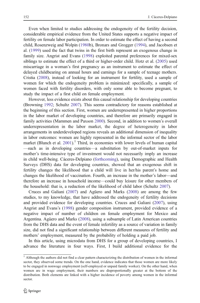 即使仅限于研究生育决定的内生性,来自美国的大量经验证据也支持生育对女性劳动力参与的负面影响。为了估计生二胎的影响,罗森茨威格和沃尔平(1980布郎纳斯和格罗格(1994),和Jacobsen等人(1999)利用了这样一个事实,即第一次出生的双胞胎代表了家庭规模的外源性变化。安格里斯特和埃文斯(1998)利用父母对混合性别兄弟姐妹的偏好来估计第三个或更高阶孩子的影响。Hotz等人(2005)利用女性第一次怀孕时的流产作为一种工具,来评估延迟生育对青少年母亲样本的年工作时间和收入的影响。Cristia(2008),而不是寻找生育工具,而是使用了一个内生性问题最小化的女性样本:具体来说,一个面临生育障碍的女性样本,其中只有一些能够怀孕,以研究第一个孩子对女性就业的影响。