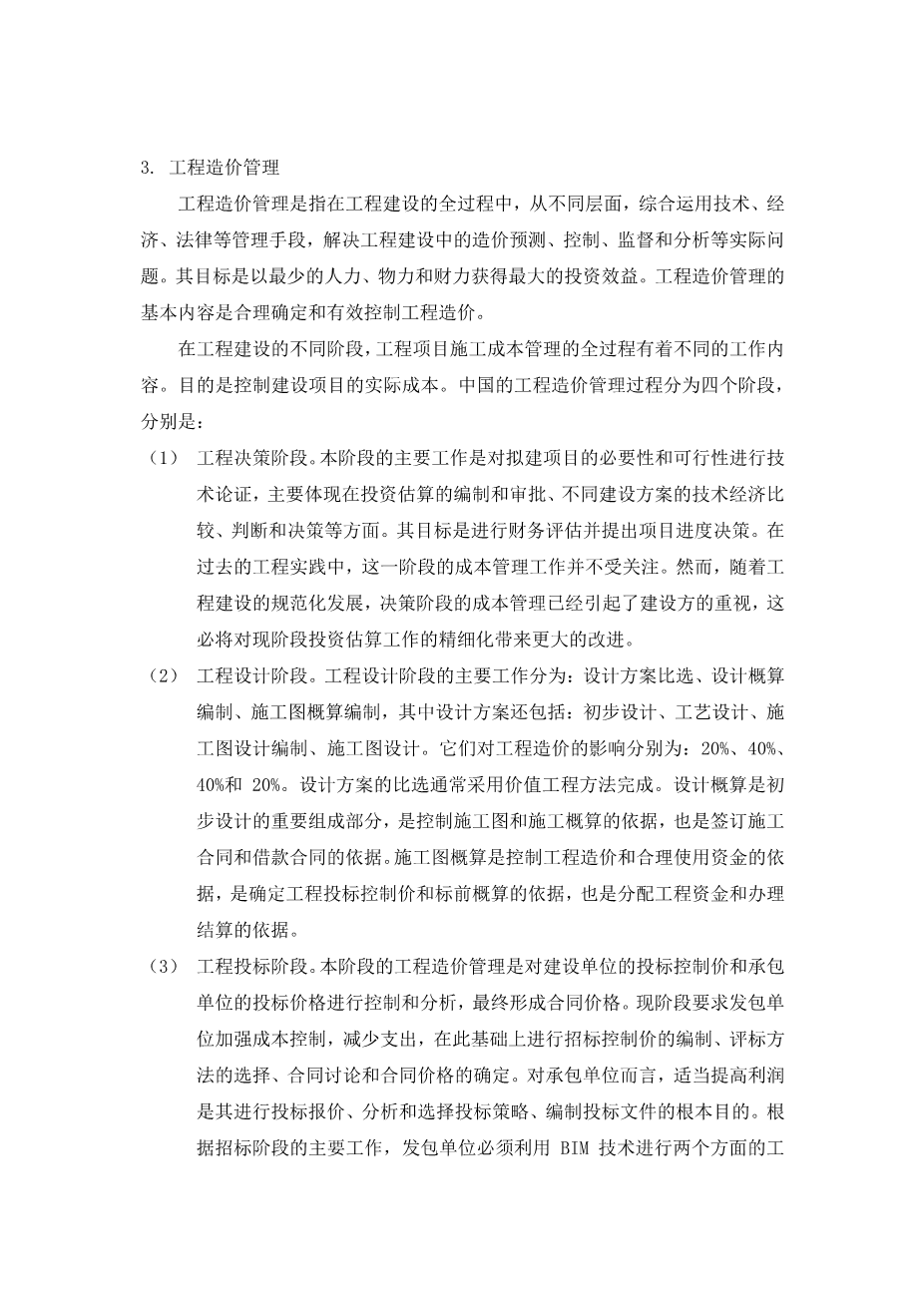 (2)Engineering Designing Stage. The main work of the engineering designing stage is divided into: comparison of design schemes and schemes, compilation of design estimate, compilation of working drawing estimate, in which, the design scheme also includes: preliminary design, technology design, construction drawing design preparation, construction drawing design. Their effects on engineering cost are as follows: 20%, 40%, 40% and 20%, respectively. The comparison and selection of the design schemes are usually completed by adopting the value engineering method. Design estimate is an important constituent part of the preliminary design, which is not only the basis of controlling the construction drawing and construction estimate, but also the basis of signing the construction contract and loan contract. Working drawing estimate is the basis of controlling the construction cost and rational using of the fund, the basis of determining the project bidding control price and pre-tender estimate, the basis of allocating the engineering fund and transacting the settlement.