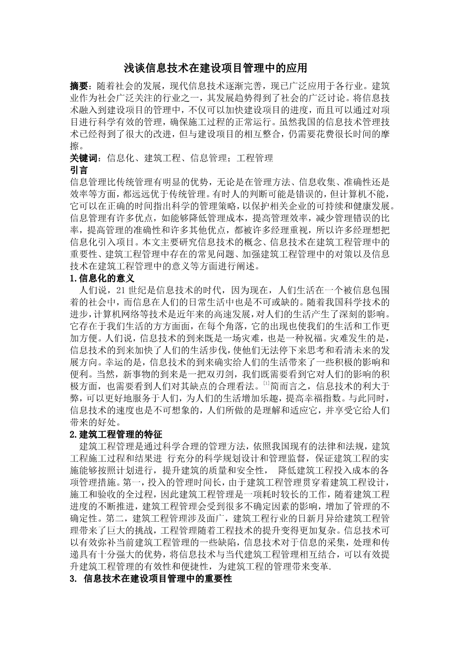 Construction engineering management is through scientific and reasonable management method, in accordance with the existing laws and regulations in our country, construction process and results of full scientific planning and design and management supervision, ensure the implementation of construction engineering according to the plan, improve the quality and safety of construction, reduce the construction project cost of the management measures.First, the investment management time is long, because the construction engineering management through the construction engineering design, the whole process of construction and acceptance, so the construction engineering management is a time-consuming work, with the progress of construction engineering, construction engineering management will be affected by a lot of uncertain factors, increase the uncertainty of management.Second, construction engineering management involves a wide range of areas. The rapid development of construction engineering industry has brought great challenges to construction engineering management, and engineering management has become more complex with the improvement of engineering technology.Information technology can effectively make up for some defects of the current construction engineering management, information technology for information collection, processing and transmission has very powerful advantages, combining information technology and contemporary construction engineering management, can effectively improve the effectiveness and convenience of construction engineering management, bring change for the management of construction engineering.