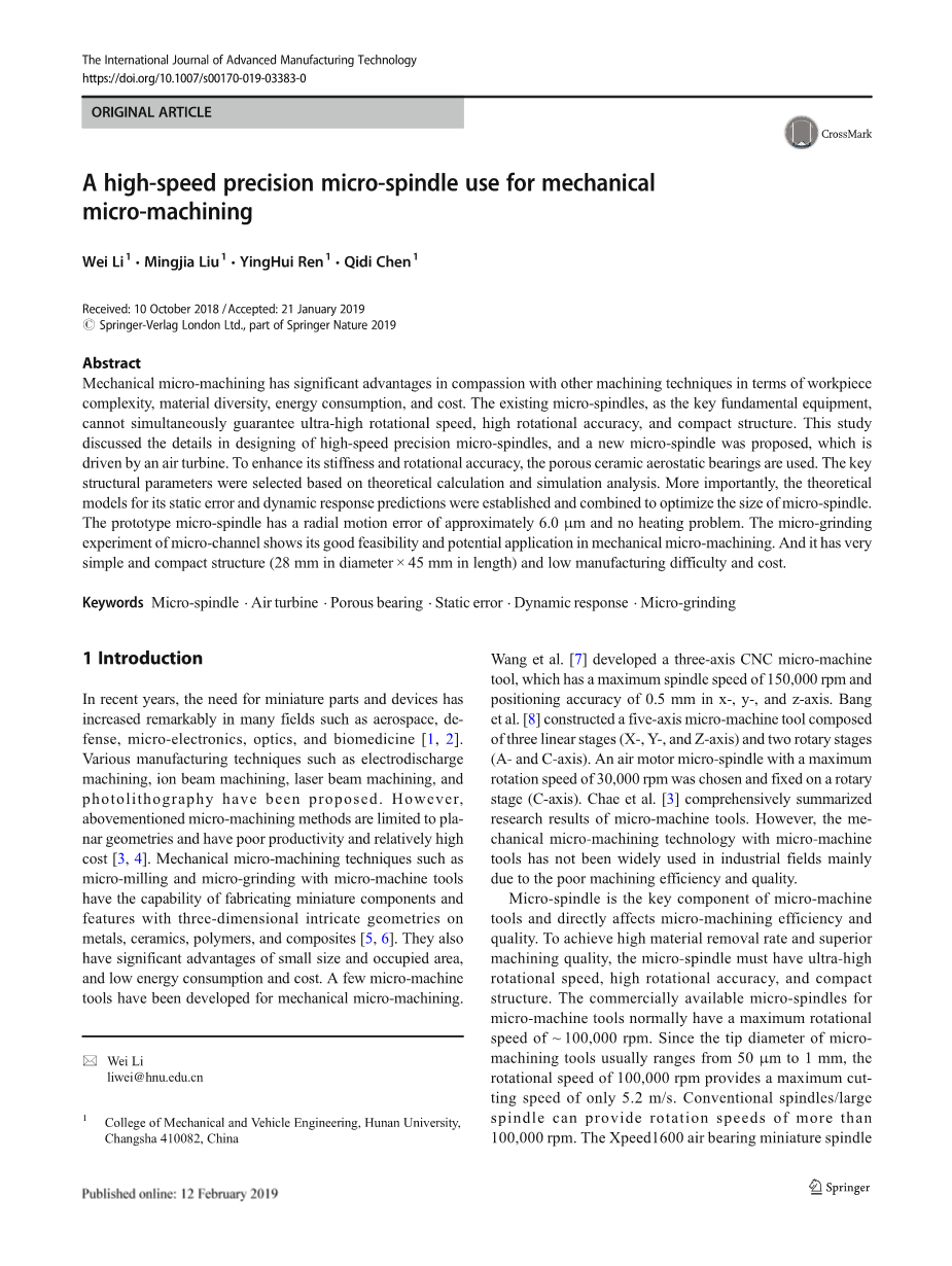 根据相关理论进行设计。然后,建立了静态误差和动态响应预测的理论模型,并对微主轴进行优化。制造了两个原型微纺锤体,并测量了它们的运动误差、转速和热生长。最后,对微主轴原型进行微磨加工性能进行了评价。