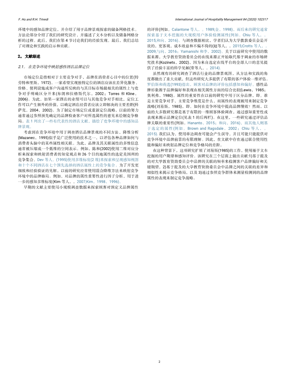 from consumersrsquo; perspective and examine the performance of various competing hotels in a market so as to achieve a clear positioning with strong market orientation (Plumeyer et al., 2017). Previous literature in hospitality industry commonly explored hotel brand positioning and competitive landscape issues by either using survey data (e.g., Brown and Ragsdale, 2002; Dev et al., 1995) limiting the insights to pre-spe- cified questions or mining UGC with reliance on a single dimension of consumer evaluations (e.g., Chiu et al., 2015; Krawczyk and Xiang, 2016). The conventional survey-based techniques are characterized by an inherently high dependence on relatively small samples with in- formation selectivity bias and thus believed relatively weak in re- flecting holistic customer experience (Krawczyk and Xiang, 2016; Lau et al., 2005). On other hand, recent studies employing large size UGC largely limited the inquiry to a unidimensional evaluation of consumer opinion on detected brand attributes on importance (e.g., Krawczyk and
