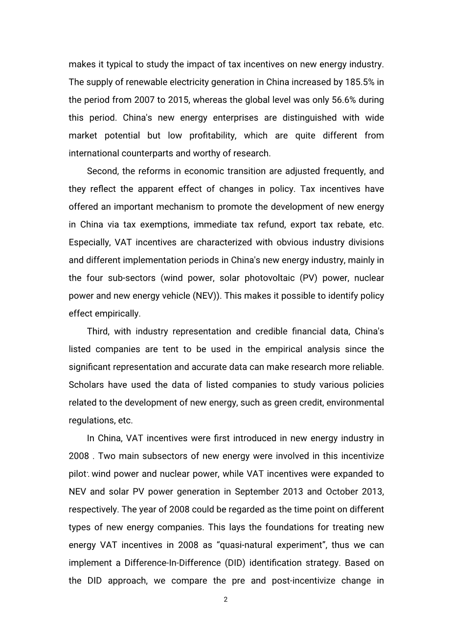 (1)通过提供企业层面的证据,延伸对新能源增值税激励评价的文献。而不是审查税收优惠在宏观层面的经济和环境影响,本研究分析了对微型企业新能源增值税退税的反应,为这一问题揭示了新的问题。结果表明,增值税优惠政策对新能源企业的ROE产生了负面影响。