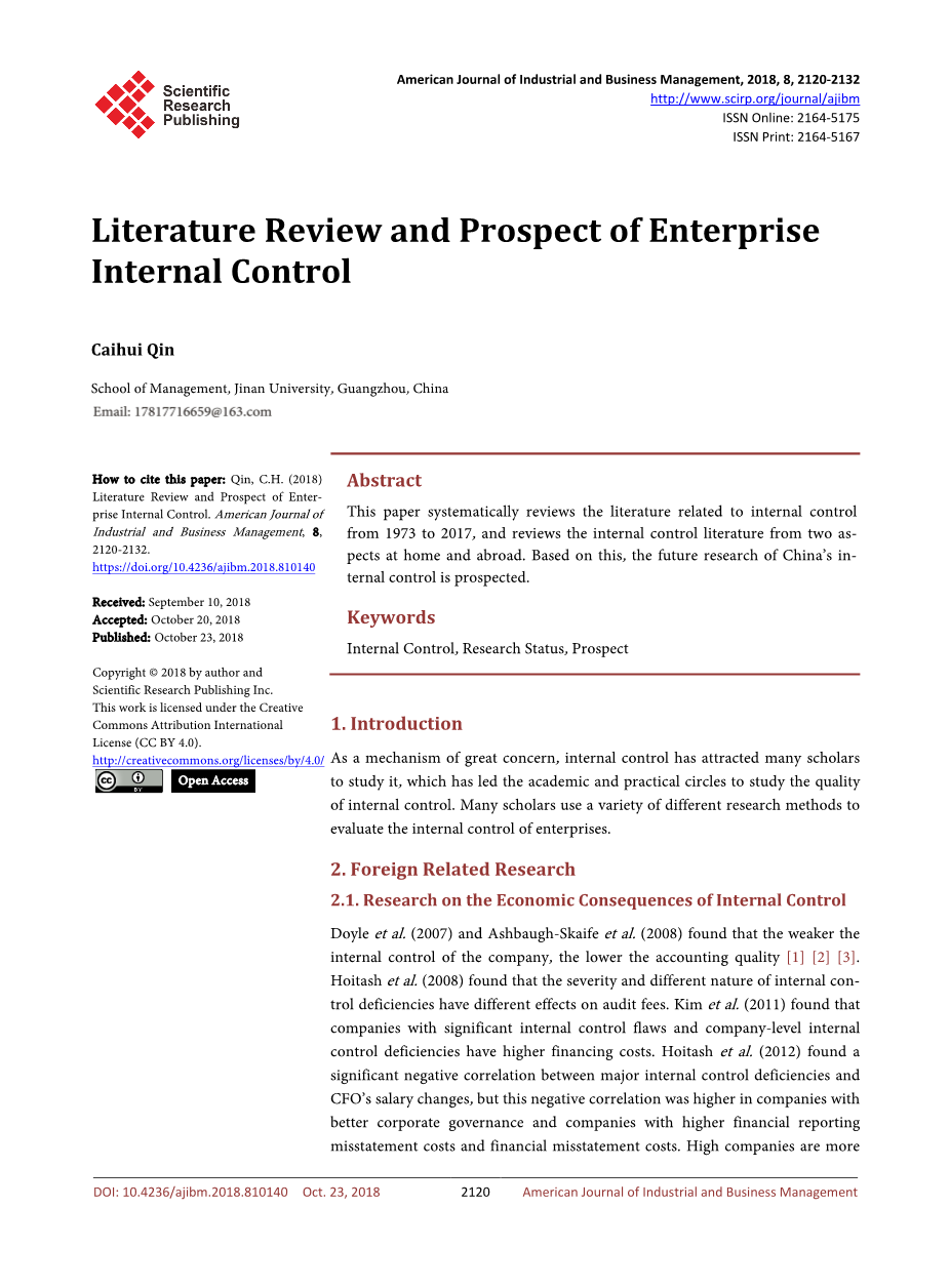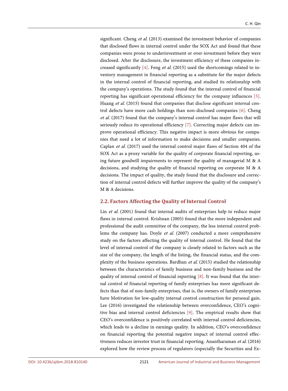 Doyle等人(2007)和Ashbaugh-Skaife等人(2008)发现,公司内部控制越弱,会计质量越低。Hoitash等人(2008年)发现,内部控制缺陷的严重性和不同性质对审计费用有不同的影响。Kim等人(2011年)发现,具有重大内部控制缺陷和公司级内部控制缺陷的公司具有更高的融资成本。Hoitash等人(2012年)发现,主要内部控制缺陷与首席财务官的薪酬变化之间存在显著的负相关关系,但这种负相关关系在公司治理较好的公司和财务报告错报成本和财务错报成本较高的公司中更高。对于来说高级公司就有更重要的意义。Cheng等人(2013)研究了根据SOX法案披露内部控制缺陷的公司的投资行为,发现这些公司在披露之前容易投资不足或过度投资。披露后,这些公司的投资效率显著提高。Feng等(2015)利用财务报告中与存货管理相关的缺陷来替代财务报告内部控制的重大缺陷,并研究其与公司经营的关系。研究发现,财务报告内部控制对公司运营效率有显著影响。Huang等(2015)发现,披露重大内部控制缺陷的公司比未披露的公司拥有更多的现金。Cheng等(2017)发现,公司内部控制存在重大缺陷,将严重降低其运营效率。纠正重大缺陷可以提高运营效率。这种负面影响对于需要大量信息进行决策的公司和较小的公司来说更为明显。Caplan等人(2017年)使用《萨班斯法案》第404节的内部控制主要缺陷作为公司财务报告质量的代理变量,使用未来商誉减值来代表M amp; A管理层决策的质量,并研究M amp; A公司决策的财务报告质量。质量的影响,研究发现,内部控制缺陷的披露和纠正将进一步提高M amp; A公司决策的质量。