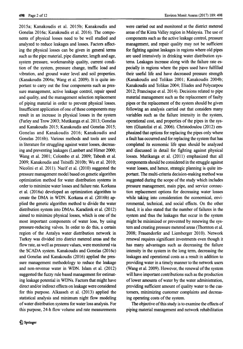 由于各种原因导致配水管网(WDNs)发生故障,导致漏水形式的水损失。水损失或无收益水(NRW)可以从最一般的意义上定义为给予系统无法收取任何费用的水(Xin et al,2008)。无收益水量可以计算为进入系统的水量总量与注册客户已开具发票的合法消耗的水量之差。无收益水的体积的主要部分是由于物理损伤导致的管网泄漏,表现为物理损失(Farleyand Trow,2003)。无收益水量的另一个组成部分称为“表观或商业损失”,其中包括所有类型的水表错误和非法使用等部分组成。(Thornton et al,2008;Frauendorfer and Liemberger,2010;Kanakoudis andTsitsifli,2010a;Kanakoudidis et al,2013;Mutikanga et al,2013;Kanakoudis and Tsitsifli,2014 ;Kanakoudisand Muhammetoglu,2014 ; Kanakoudis and Gonelas,2014 ; Kanakoudis et al,2014 ;Kanakoudis et al,2015a; Kanakoudis et al . 2015b; Kanakoudis and Gonelas 2016a ; Kanakoudis et al . 2016 ) 。为了减少管网泄漏和损失,需要对物理损失的原因进行充分的研究和分析。影响因素例如管道长度可以用一般术语表示材料、管道直径、长度和使用年限、管网工艺质量、管网现状、压力变化、交通荷载和振动、地下水位和土壤性质。(Kanakoudis 2004a ; Wang et al . 2009)。为了防止物理损失,实施压力管理、主动控制泄漏、维修速度和质量以及管道材料的管理选择和更换等四个非常重要组成部分。这些组成部分中的一个应用不足可能会导致系统中物理损失的增加(Farley and Trow,2003;Mutikanga et al,2013。Gonelasand and Kanakoudis,2015 ;Kanakoudis and Gonelas ,2015;Gonelas and Kanakoudis ,2016;Kanakoudis and Gonelas ,2016b)。文献中有各种方法和工具可用于防止水流失,减少和渗漏(Lambert and Hirer,2000;Wang et al ,2001;Colombo et al,2009;Tabesh et al,2009 ;Kanakoudis and Tsitsifii,2010b ;Wu et al ,2010;Nicolini et al ,2011 ) 。Nazif et al,(2010)建议采用基因藻类优性方法对配水系统进行调节,以最大限度地减少水的损失和故障率。Korkana et al,(2016a)应用遗传算法方法将水分配系统划分为DMA系统。Korkana et al,(2016b)利用遗传算法将配水系统划分为多个决策单元。 Karadirek et al(2012)致力于通过使用减压阀将物理损失降到最低,物理损失是水损失的最重要组成部分之一。为此,安塔利亚供水网络在土耳其被划分为区域计量区域,并通过监控与数据采集系统监测流量和压力值。Kanakoudis and Gonelas ( 2016c )和Gonelas and Kanakoudis ( 2016 )应用压力管理方法来减少配水管网中的漏水和无收益水量。Islam et al ,( 2012 )提出了基于模糊规则的管理方法,用于估计配水管网中的泄漏可能性。为此,考虑了可能对泄漏产生直接或间接影响的因素。Alkasseh et al ,( 2013 )将供水系统的统计分析和最小夜间流量模型用于水损失分析。为此,在饮用水分配系统中大量使用旧管道的地区,对诸如主动泄漏控制,压力管理和维修质量等区域计量组件进行了24小时流量和速率测量和监测。泄漏随着故障率的增加而增加特别是在使用管道已实现其使用寿命并降低压力强度的地区。(Kanakoudis and Tolikas ,2001 ; Kanakoudi,2004b;Kanakoudis and Tolikas,2004;Eliades and Polycarpou,2012 ;Francisque et al ,2014 ) 。与管道材料管理有关的决策(例如,更换故障管道或更换管网)应给定以下变量,例如管网中的失效强度,运营成本以及管网中管道的性能(Giustolisi et al,2006)。Christodoulou(2012)强调,只有在发生故障时才更换管道和更换已达到其经济寿命的管网的备选方案应进行分析和详细讨论,以应对物理损失。Mutikanga et al ,( 2011)强调在与水损失的斗争中应考虑所有组成部分,因此,战略规划非常重要。多标准决策方法是研究压力管理、主管道连接,以减少水损失,同时兼顾经济、环境、技术和社会影响。另一方面,报告还指出,管网故障的数量以及系统中发生的泄漏可能通过更新管网和创建压力计量区域来最小化或防止。(Thornton et al ,2008 Frauendorfer and Liemberger ,2010 ) 。管网更新需要大量的投资,尽管它具有许多优点,例如,从长远来看降低管网的故障强度,减少泄漏和运营成本,以及及时向用户供水(Wang et al)。但是,管网的更新将具有重要的贡献,例如水管理部门可以生产较少量的水,向客户提供足够数量的优质的水,最大程度地减少客户的抱怨并降低管网的运营成本。这项研究的目的是检验管道材料管理和管网修复,配水管网中的物理损失和水损失管理的效果。为此,已经选择了代尼兹利配水管网作为应用领域。以评估并比较了代尼兹利配水管网更新之前和之后的故障强度,失水率和运行条件。