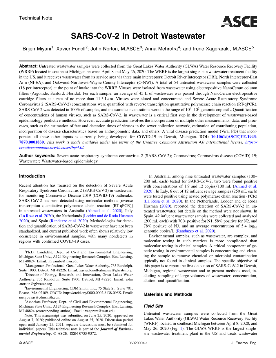 Untreated wastewater samples were collected from the Great Lakes Water Authority (GLWA) Water Resource Recovery Facility (WRRF) located in southeast Michigan between April 8 and May 26, 2020. The WRRF is the largest single-site wastewater treatment facility in the US, and it receives wastewater from its service area via three main interceptors: Detroit River Interceptor (DRI), North Interceptor-East Arm (NI-EA), and Oakwood-Northwest-Wayne County Interceptor (O-NWI). A total of 54 untreated wastewater samples were collected (18 per interceptor) at the point of intake into the WRRF. Viruses were isolated from wastewater using electropositive NanoCeram column filters (Argonide, Sanford, Florida). For each sample, an average of 45 L of wastewater was passed through NanoCeram electropositive cartridge filters at a rate of no more than 11.3 L=m. Viruses were eluted and concentrated and Severe Acute Respiratory Syndrome Coronavirus 2 (SARS-CoV-2) concentrations were quantified with reverse transcription quantitative polymerase chain reaction (RT-qPCR). SARS-CoV-2 was detected in 100% of samples, and measured concentrations were in the range of 104–105 genomic copies/L. Quantification of concentrations of human viruses, such as SARS-CoV-2, in wastewater is a critical first step in the development of wastewater-based epidemiology predictive methods. However, accurate prediction involves the incorporation of multiple other measurements, data, and proc- esses, such as the estimation of fate and detention times of viruses in the sewer collection network, estimation of contributing population, incorporation of disease characteristics based on anthropometric data, and others. A viral disease prediction model (Viral PD) that incor- porates all these other inputs is currently being developed for COVID-19 in Detroit, Michigan. DOI: 10.1061/(ASCE)EE.1943- 7870.0001830. This work is made available under the terms of the Creative Commons Attribution 4.0 International license, https:// creativecommons.org/licenses/by/4.0/.