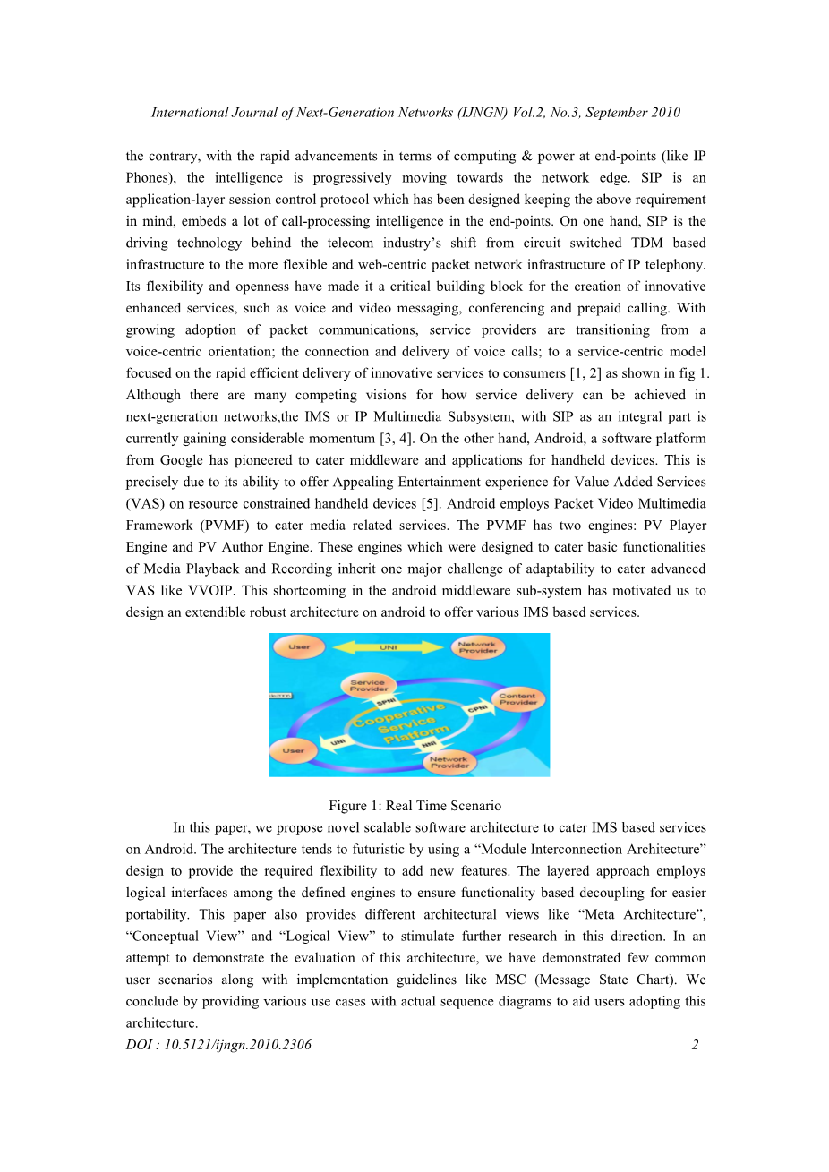 摘要 IP多媒体子系统(IMS)以其突出的服务提供而闻名,它也为手持设备上的视频语音(VVOIP)等应用铺路。 Android是来自Google的软件平台,它在手持设备的中间件和应用领域开创中处于领先地位,但是它还未通过设计给IMS服务提供支撑。