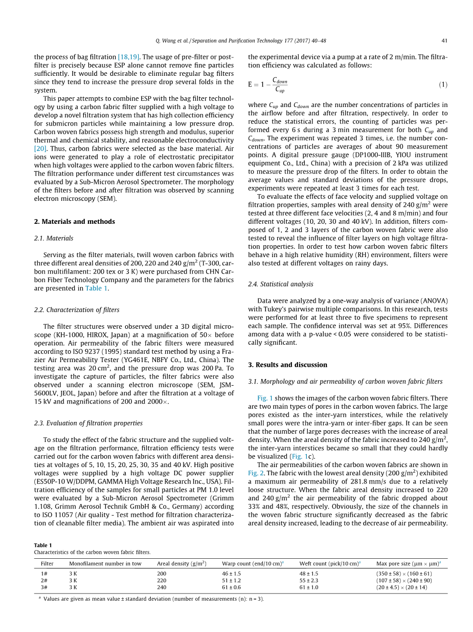 用于去除PM1.0颗粒的碳纤维织物过滤器在高电压下的过滤性能