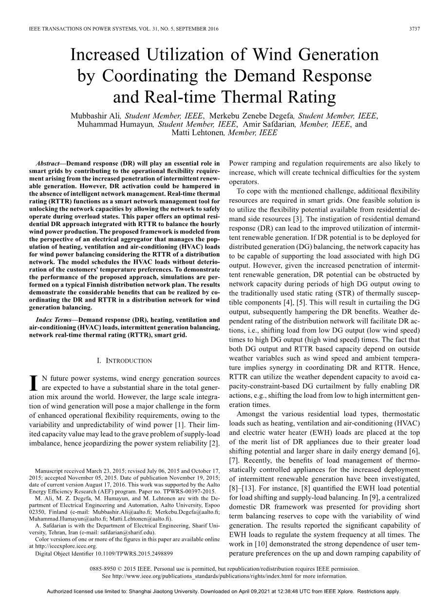 关键词:需求侧响应(DR)、供暖,通风和空调(HVAC)负荷、 间隔发电平衡、网络实时热额定值(RTTR)、智能电网。