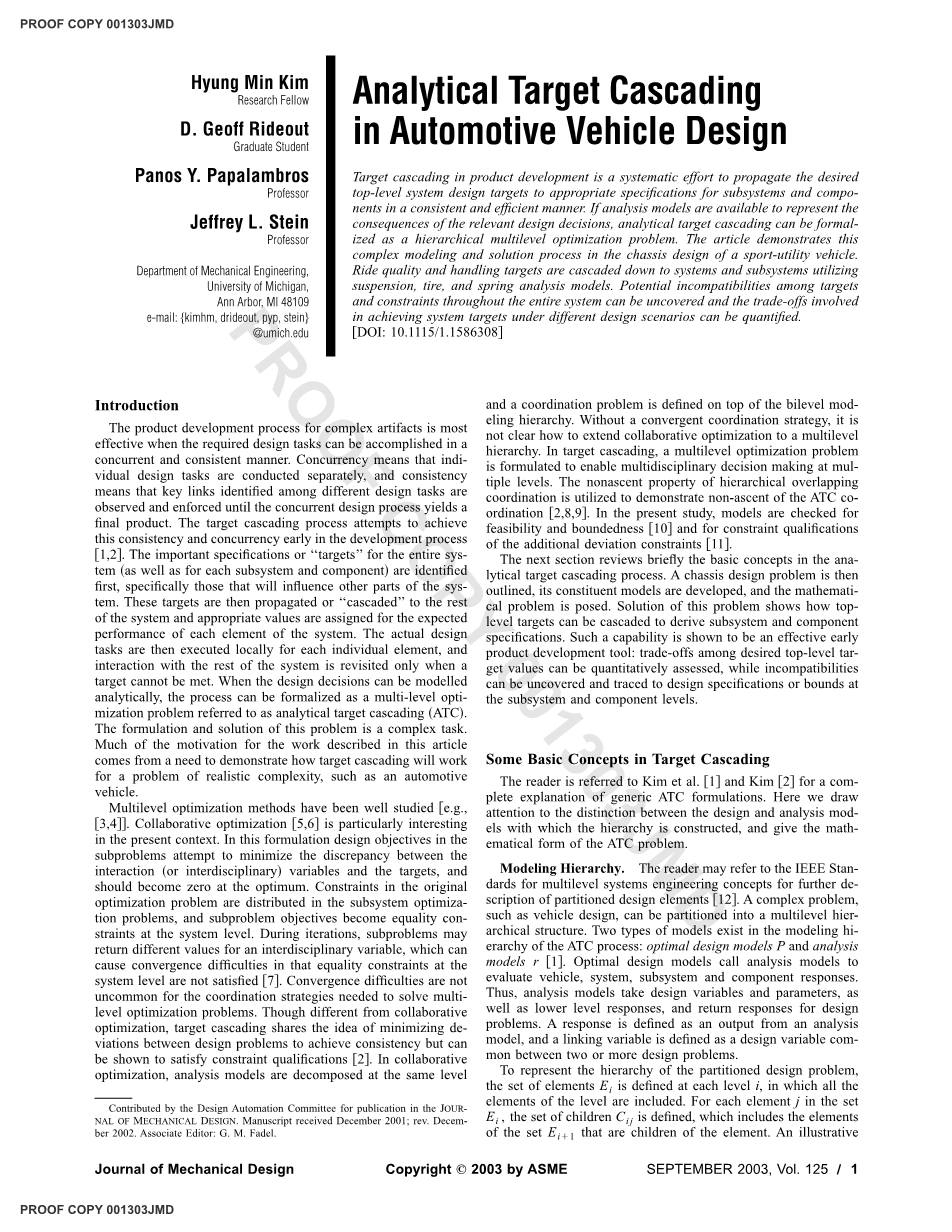 当所需的设计任务可以以同时和一致的方式完成时,复杂对象的产品开发过程最有效。并发指个别设计任务单独执行,一致性指在不同设计任务之间观察和执行关键链接,直到并发设计过程产生最终产品。目标级联过程尝试在开发过程[1,2]的早期实现这种一致性和并发性。首先确定整个系统(以及每个子系统和组件)的重要规范或“目标”,特别是那些会影响系统其他部分的规范。然后将这些目标传播或级联”传播到系统的其他部分,并为系统的每个元素的预期性能分配适当的值。然后为每个元素在本地执行实际的设计任务,只有在无法满足目标时,才能重新访问与系统其他部分的交互。当设计决策可以被分析地建模时,这个过程可以被形式化为一个多层次的优化问题,称为分析目标级联(ATC)。这个问题的制定和解决是一项复杂的任务。本文中所描述的工作的许多动机来自于需要演示目标级联将如何解决现实复杂的问题,比如汽车。.