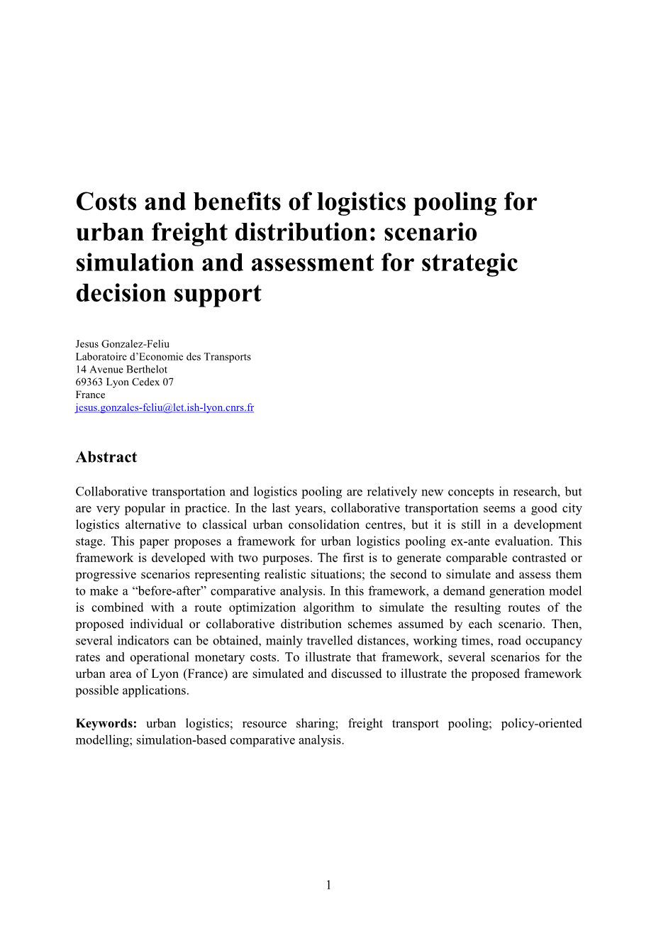 另一个解决方案是物流池,可以类似于拼车定义为物流资源的共同使用:材料(车辆、平台)、人力、驾驶员、土地运营商)和非物质(软件工具、信息)。我们观察到过去几年的几个城市物流资源共享项目,其中大多数仍处于开发阶段(冈萨雷斯-费利乌和莫拉纳,2011年)。这些项目的目标是建立一个半封闭的合作者小组,共享车辆和平台,以降低物流成本和与城市密集地区最后一英里分布相关的环境问题。虽然欧洲已经开始了几个城市物流池项目,但它们仍处于概念层面,而且还没有进行任何实验或评估。对物流系统的评估很重要,因为该系统的性能将在“事前”进行评估(Filippi等人,2010),并将激励公共当局实施试点阶段或部署这些系统。这就是LUMD项目(2011年至今)的情况,它将于2012年年中在斯特拉斯堡(法国)进行一次实验。