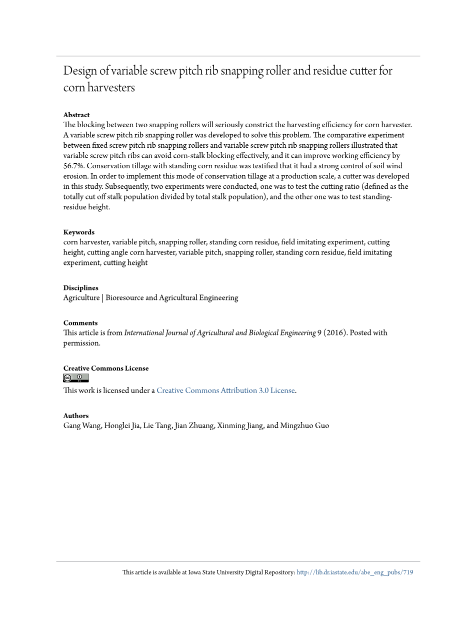 关键词:玉米收获机,变节距,摘穗辊,玉米残茬,田间模拟试验,割高,割角