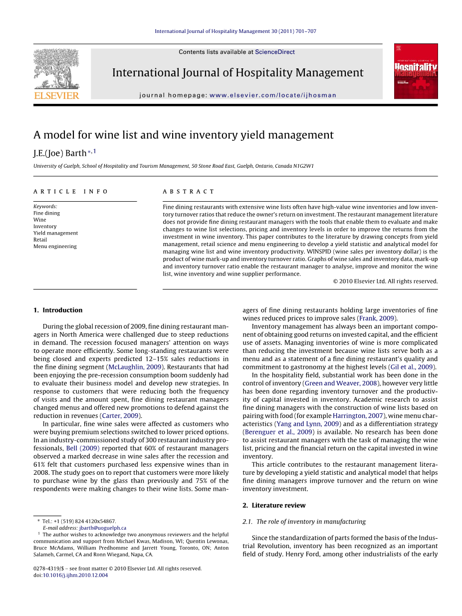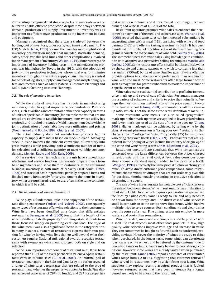 在酒店领域,在库存的控制方面已经做了大量的工作(Green and Weaver, 2008),然而在库存周转率和投资于库存的资本生产力方面却做得很少。学术研究,以协助高级餐厅经理构建基于配对的食物(如哈林顿,2007年),葡萄酒菜单特点(杨和林恩,2009年)和作为差异化战略(贝伦格等人,2009年)是可用的。目前还一个葡萄酒目录和葡萄酒库存产量管理的模型定价以及投资葡萄酒库存的资金的财务回报。