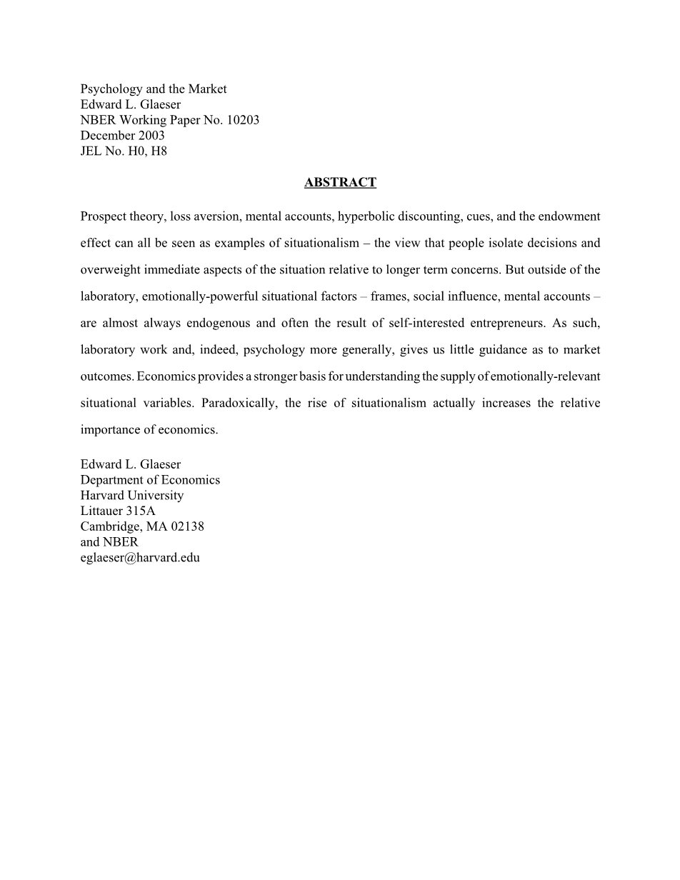 前景理论、损失厌恶、心理账户、双曲线贴现、暗示和禀赋效应都可以被视为情景主义的例子,即人们孤立决策,并且相对于长期关注的问题过重了形势的直接方面。但是,在实验室之外,情绪上强大的情境因素——框架、社会影响、心理账户——几乎总是内生的,通常是自利企业家的结果。因此,实验室工作,事实上,一般来说,心理学,对我们的市场结果几乎没有指导作用。经济学为理解情绪相关情境变量的供给提供了更为坚实的基础。矛盾的是,国家主义的兴起实际上增加了经济学的相对重要性。