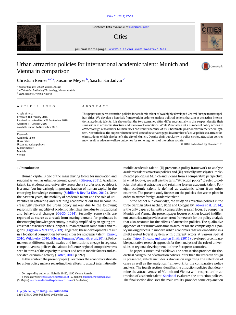 本文比较了两个高度发达的中欧大都市的学术人才吸引政策。 我们开发了一个启发式框架,以分析旨在吸引国际学术人才的政治行动。 这表明,这两个被审查的城市在这方面有很大的不同,尽管它们在经济结构和框架条件上相似。 虽然维也纳已经制定了一些政策行动来吸引外国研究人员,但慕尼黑由于其在联邦体系中的从属地位而面临限制。 尽管如此,巴伐利亚联邦州的上级采取了一些积极的政策来吸引外国学生,这也有利于慕尼黑市。 尽管它们在政策界很受欢迎,但吸引政策可能会给城市社会的一些阶层带来不利的福利结果。