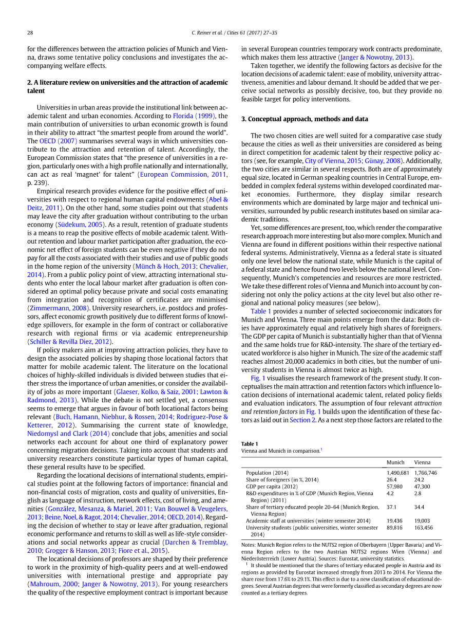 这两个选定的城市非常适合进行比较案例研究,因为这些城市及其大学被认为是各自的政策行为者对学术人才的直接竞争(例如,见)。 维也纳市,2015年;Gunay,2008年 此外,这两个城市在几个方面相似。 这两个国家的规模大致相等,位于中欧讲德语的国家,在发达的协调市场经济中嵌入了复杂的联邦制度。 此外,他们展示了类似的研究环境,这些环境由大型主要大学和技术大学主导,周围是基于类似学术传统的公共研究机构。