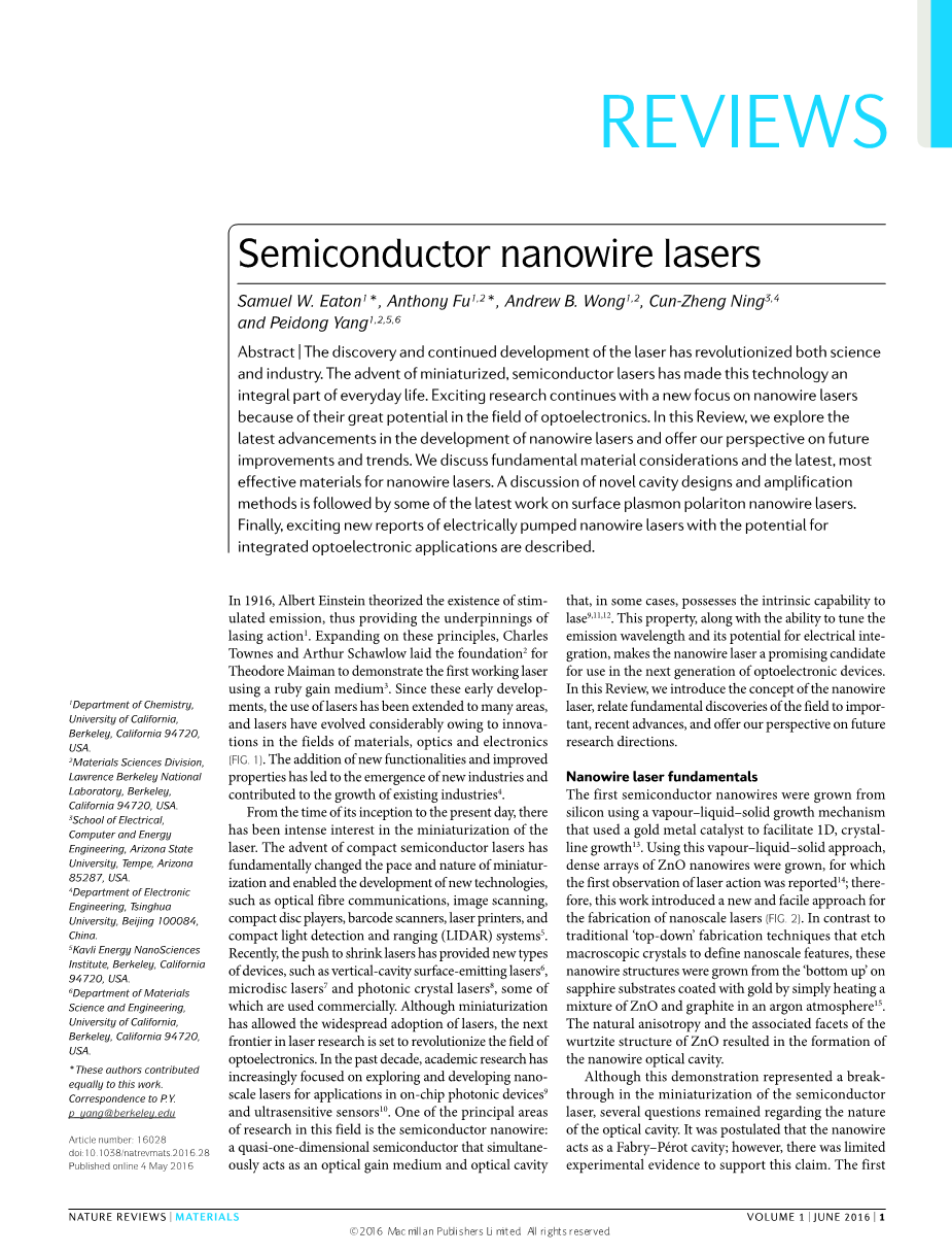 摘要:激光的发现和持续发展彻底改变了科学和工业。微型半导体激光器的出现使这项技术成为日常生活中不可缺少的一部分。令人兴奋的研究继续着眼于纳米线激光器,因为它们在光电子领域具有巨大的潜力。在本论文中,我们将探讨纳米线激光器这几年的最新进展,并对未来纳米线激光器的发展空间以及发展趋势提供自己的见解。主要讨论基本材料考虑因素和最新的最有效的纳米线激光材料。并在表面等离子体激元纳米线激光器最新工作进展的基础上,进行讨论关于新型腔设计和放大的方法。最后,叙述了一些具有集成光电应用潜力的电泵浦纳米线激光器的报告。