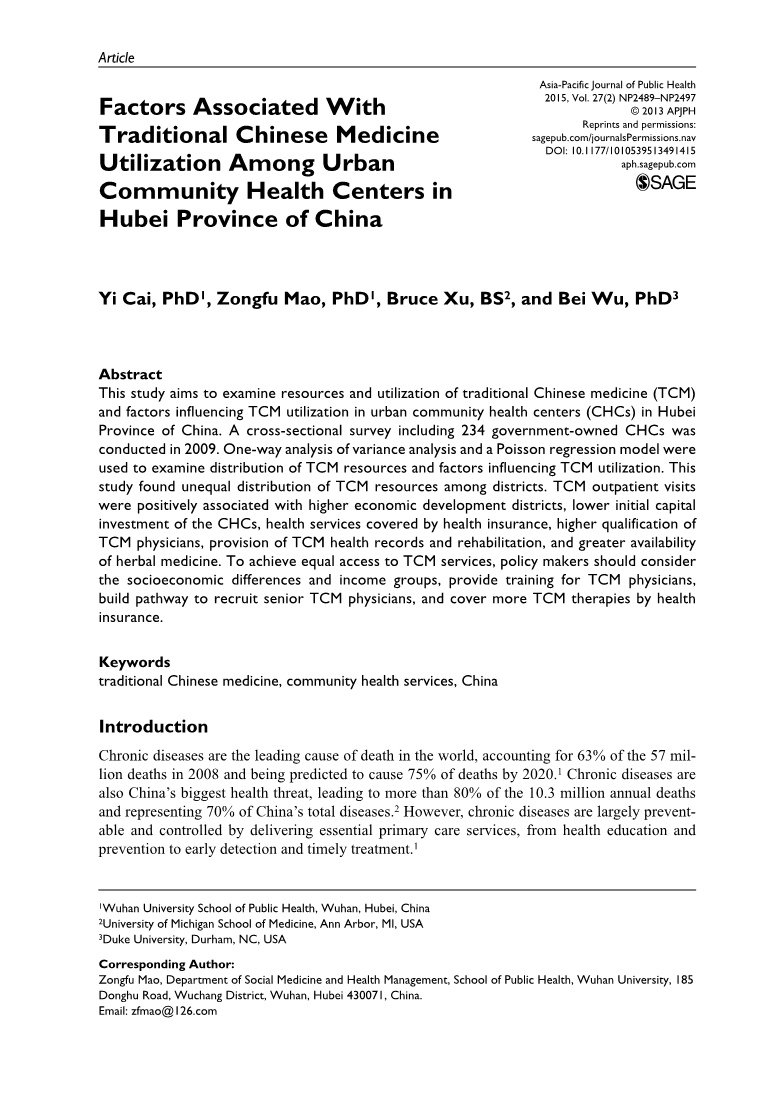 摘要:本研究旨在探讨中国湖北省城市社区卫生中心(CHCs)中药资源和利用以及影响中药利用的因素。2009年进行了一项横断面调查,包括234个政府拥有的CHC。采用单因素方差分析和泊松回归模型对中药资源分布和影响中药利用的因素进行了研究。这项研究发现,各地区之间中医药资源的分配不平等。中医门诊就诊与较高的经济发展区、卫生保健中心较低的初始资本投资、健康保险所涵盖的卫生服务、中医医生资格的提高、中医健康记录和康复的提供以及草药的供应增加呈正相关。为了实现平等获得中医服务,政策制定者应考虑社会经济差异和收入群体,为中医师提供培训,建立招聘高级中医师的途径,并通过健康保险覆盖更多的中医治疗。