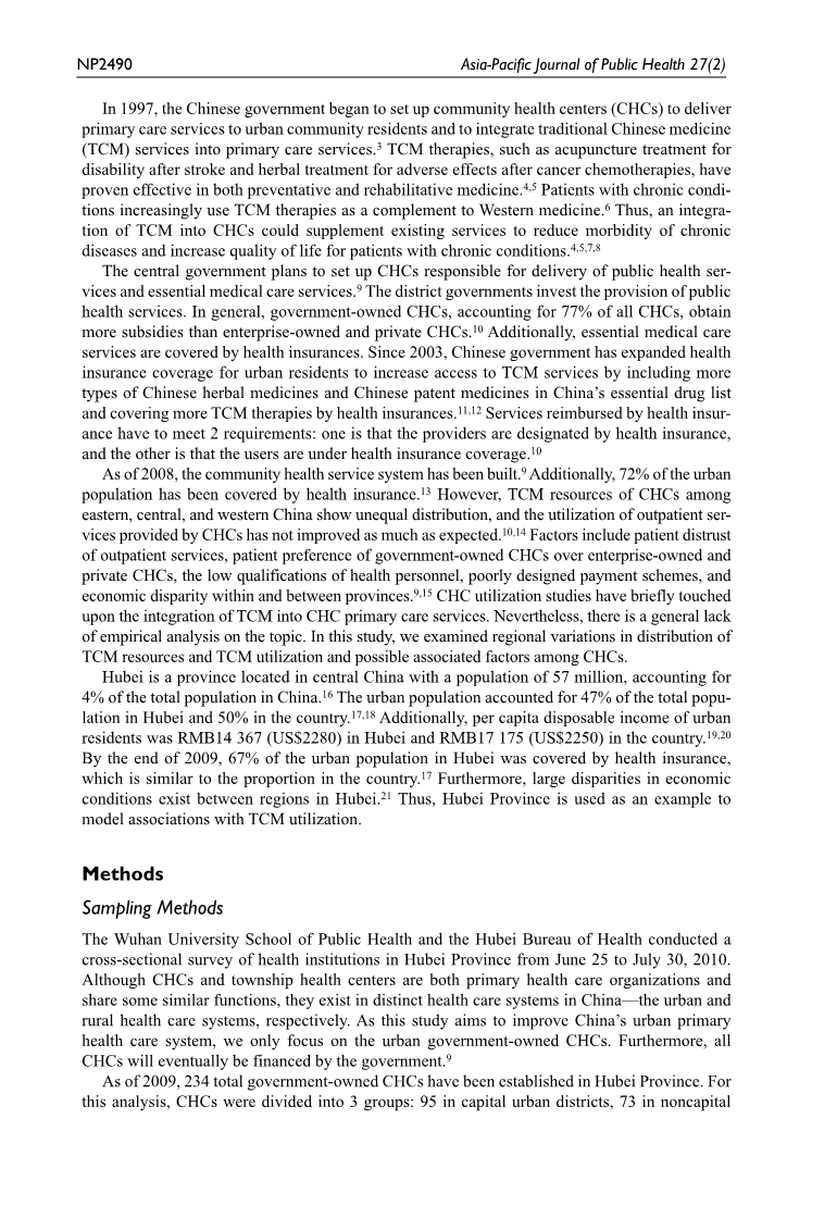 此次数据是使用国家中医药管理局设计的问卷收集的。湖北省卫生局协助武汉大学公共卫生学院培训所有调查人员,为调查做准备。调查人员包括来自湖北省所有国有CHC的管理人员,来自地区卫生局的工作人员以及武汉大学公共卫生学院的研究生。2010年6月,电子问卷被发送到CHC,并由训练有素的管理人员填写。一周后,经过培训的管理人员开始在公共卫生学院研究人员的联系支持下,将数据输入国家中医药管理局设计的数据库。