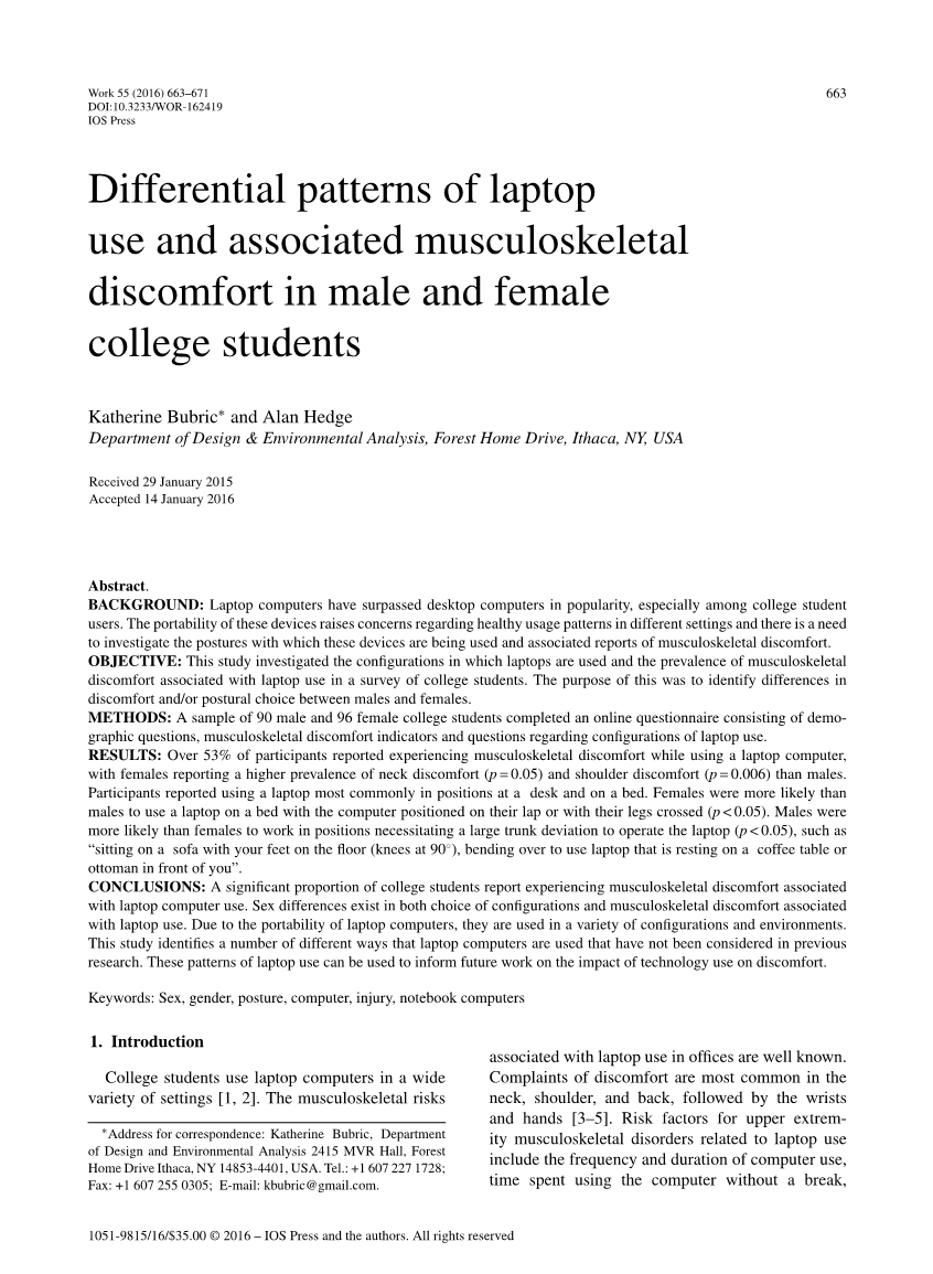 目标:本研究调查了使用笔记本电脑的配置以及在大学生调查中与笔记本电脑使用相关的肌肉骨骼不适的普遍性。这样做的目的是确定男性和女性在不适和/或姿势选择方面的差异。