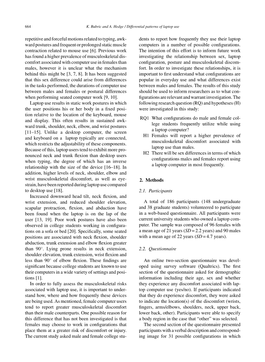 为了全面评估与使用笔记本电脑相关的肌肉骨骼风险,了解这些设备的使用方式、地点和频率非常重要。如前所述,女性电脑用户比男性用户更容易报告肌肉骨骼不适。造成这种差异的一个尚未调查的可能原因是,女性可能会选择在使她们面临更大的不适或受伤风险的配置中工作。目前的研究要求男女大学生报告他们在多种可能的配置下使用笔记本电脑的频率。这项工作的目的是为今后研究性别、笔记本电脑配置、姿势和肌肉骨骼不适之间的关系提供信息。为了研究这些关系,首先了解日常使用中流行的配置以及男性和女性之间存在哪些差异很重要。这项研究的结果应用于告知研究人员哪些配置是相关的并需要进行调查。本研究调查了以下研究问题 (RQ) 和假设 (H):