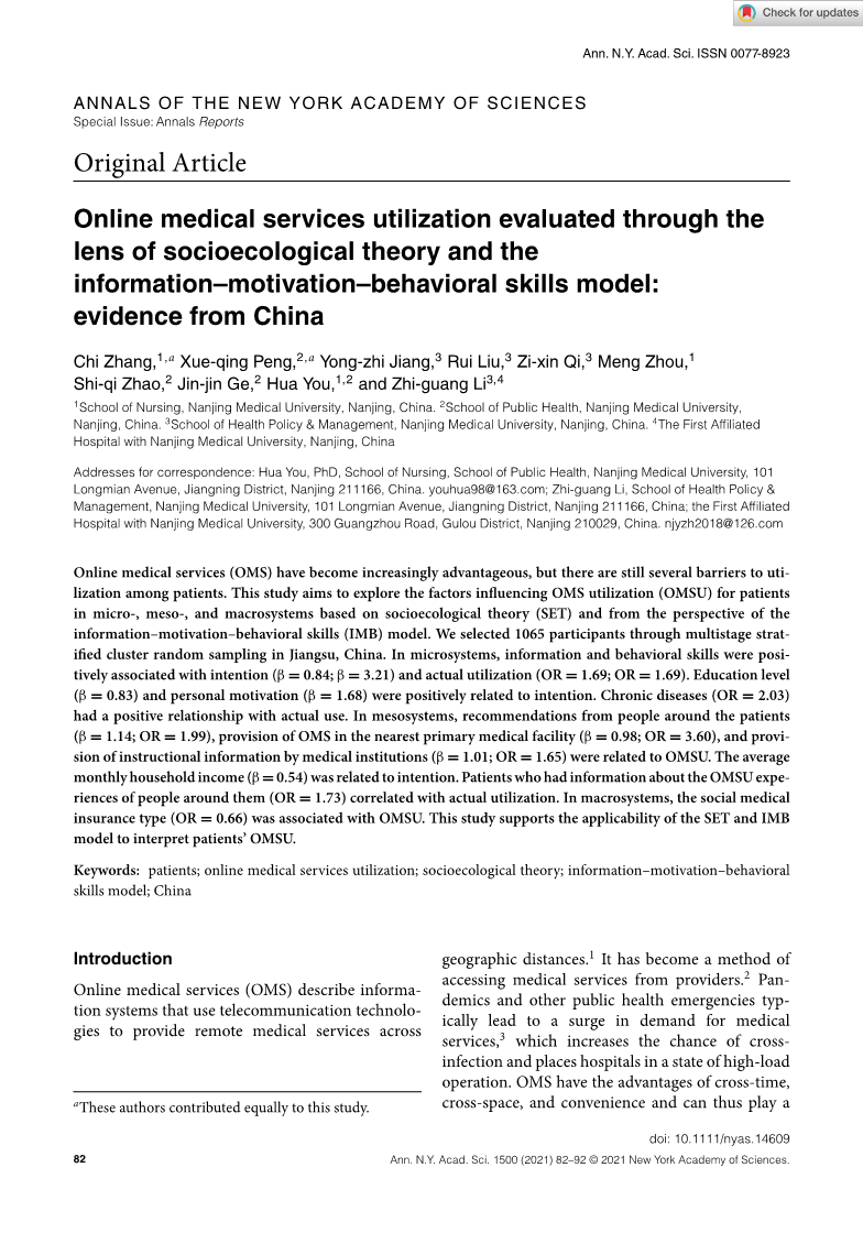 摘要:在线医疗服务(OMS)已经变得越来越有优势,但在患者中的使用仍然存在一些障碍。本研究旨在基于社会生态学理论(SET),从信息-动机-行为技能(IMB)模型的角度,探讨影响患者利用OMS(OMSU)的微观、中观和宏观系统的因素。我们在中国江苏通过多阶段分层整群随机抽样选择了1065名参与者。在微观系统中,信息和行为技能与意向(beta;=0.84;beta;=3.21)和实际利用(OR=1.69;OR=1.69)呈正相关。教育水平(beta; = 0.83)和个人动机(beta; = 1.68)与意向呈正相关。慢性病(OR = 2.03)与实际使用有正相关关系。在中间系统中,患者周围人的推荐(beta;=1.14;OR=1.99),最近的初级医疗机构提供的OMS(beta;=0.98;OR=3.60),以及医疗机构提供的指导信息(beta;=1.01;OR=1.65)都与OMSU有关。家庭平均月收入(beta; = 0.54)与意向有关。掌握周围人的OMSU经验信息的患者(OR = 1.73)与实际利用有关。在宏观系统中,社会医疗保险类型(OR = 0.66)与OMSU相关。本研究支持SET和IMB模型的适用性,以解释患者的OMSU。