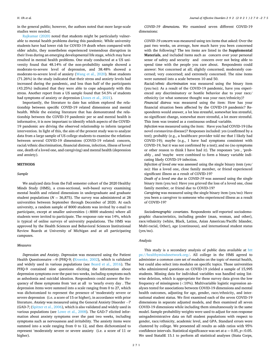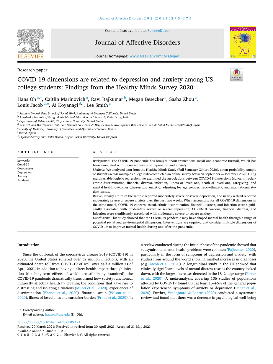 新冠肺炎维度与美国大学生的抑郁和焦虑相关:2020年健康心理调查的结果