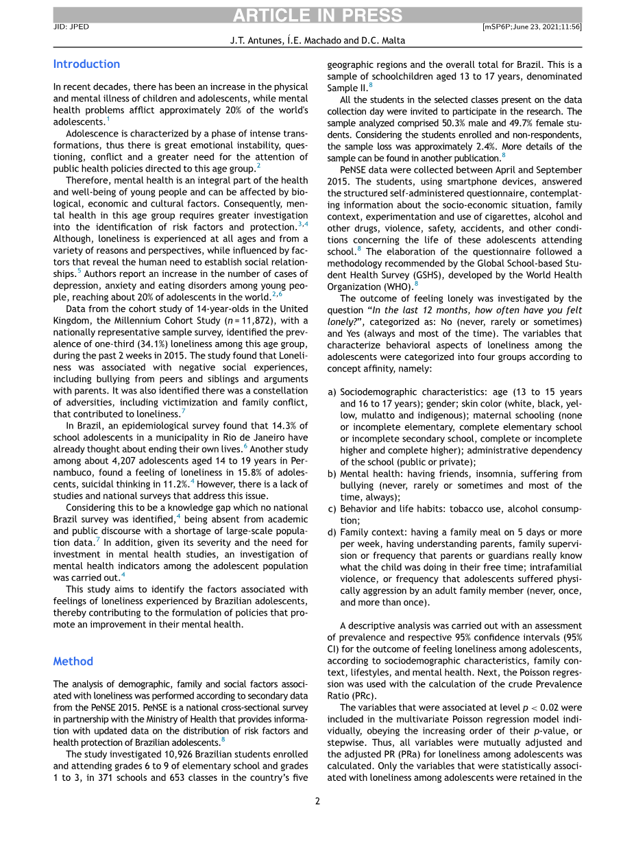 摘要:目的:探讨巴西青少年孤独的相关因素与孤独的严重程度。联合国估计,全世界大约20%的青少年存在心理健康问题。方法:这是一项横断面研究,数据来自2015年全国青少年学校健康调查,调查对象是巴西13-17岁的学生。对报告的孤独感患病率进行统计学分析。采用泊松回归和校正后的患病率比来评估社会人口统计学特征、家庭背景、心理健康和生活方式以及孤独感之间的关系。结果:15.5%的巴西学生表示在过去12个月里感到孤独。女性、高等学历、失眠和受欺凌者大多数时间或总是有较高的孤独患病率。有朋友、每周与父母或监护人共进5天以上的晚餐,了解父母,其孤独的患病率较低。结论:青少年孤独感非常常见,与女性、社会和家庭支持较少、家庭暴力、饮酒、欺凌等风险行为有关。应制定政策,促进这一年龄组的身心健康,促进友谊和家庭参与青少年的生活。