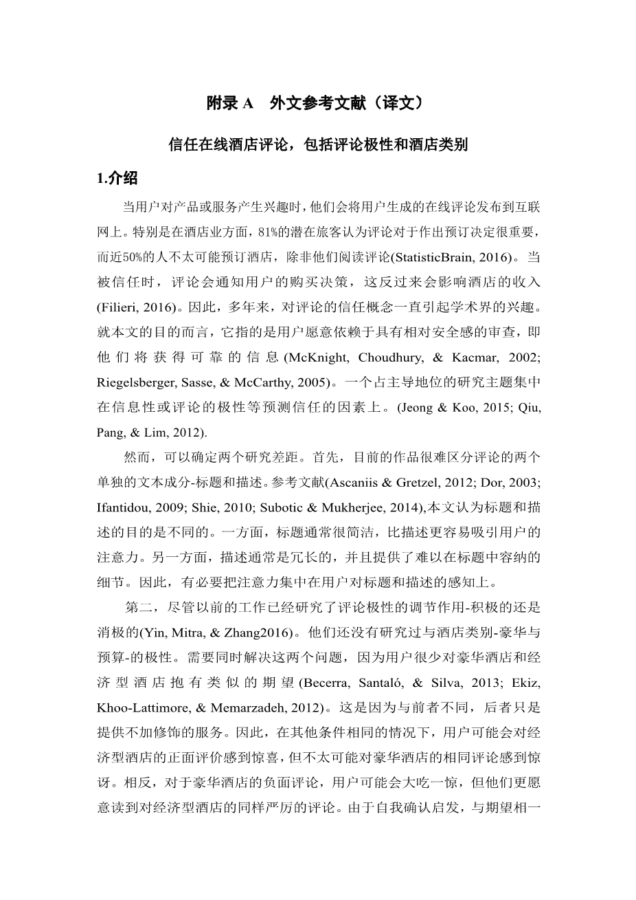 When users develop an interest in a product or a service, they turn user-generated online reviews posted on the Internet. Particularly in the context of the hotel industry, 81% of potential travellers consider reviews important to make booking decisions, and close to 50% are unlikely to book a hotel unless they read reviews (StatisticBrain, 2016). When trusted, reviews inform users purchase decision-making, which in turn can impact hotels revenues (Filieri, 2016). Hence, the concept of trust in reviews has been piquing scholarly interest over the years. For the purpose of this paper, it refers to users willingness to depend on reviews with a sense of relative security that they will receive reliable information (McKnight, Choudhury, amp; Kacmar, 2002; Riegelsberger, Sasse, amp; McCarthy, 2005). A dominant research theme focuses on factors such as informativeness or polarity of reviews that predict trust (Jeong amp; Koo, 2015; Qiu, Pang, amp; Lim, 2012).