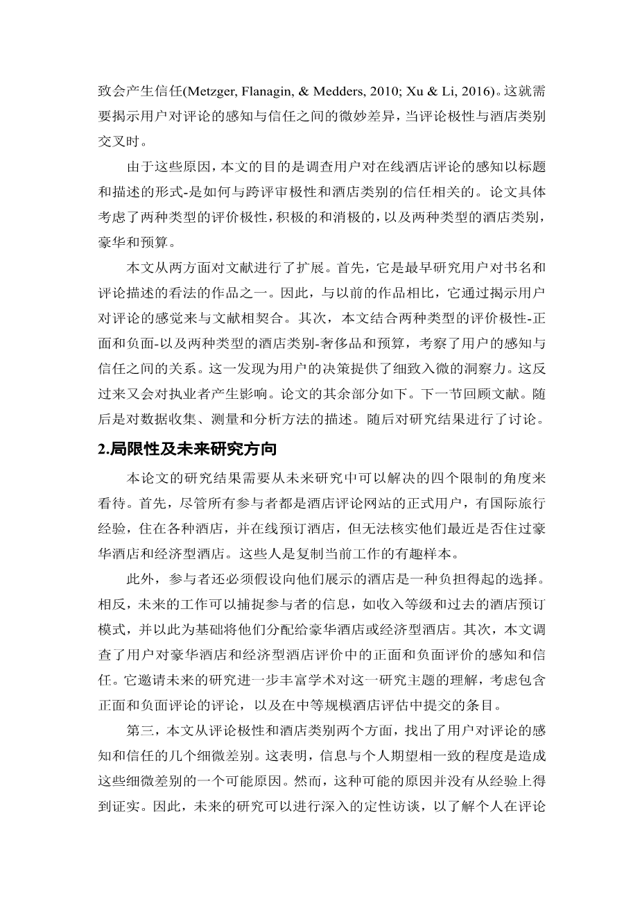 Third, this paper identified several nuances in users perception and trust in reviews across review polarity and hotel category. It suggests that the degree to which information is aligned to individuals expectation is a possible reason for these nuances. However, such a possible reason was not empirically verified. Hence, future research could conduct in-depth qualitative interviews to understand individuals motivations and reasons to process information differently across review polarity and hotel category.