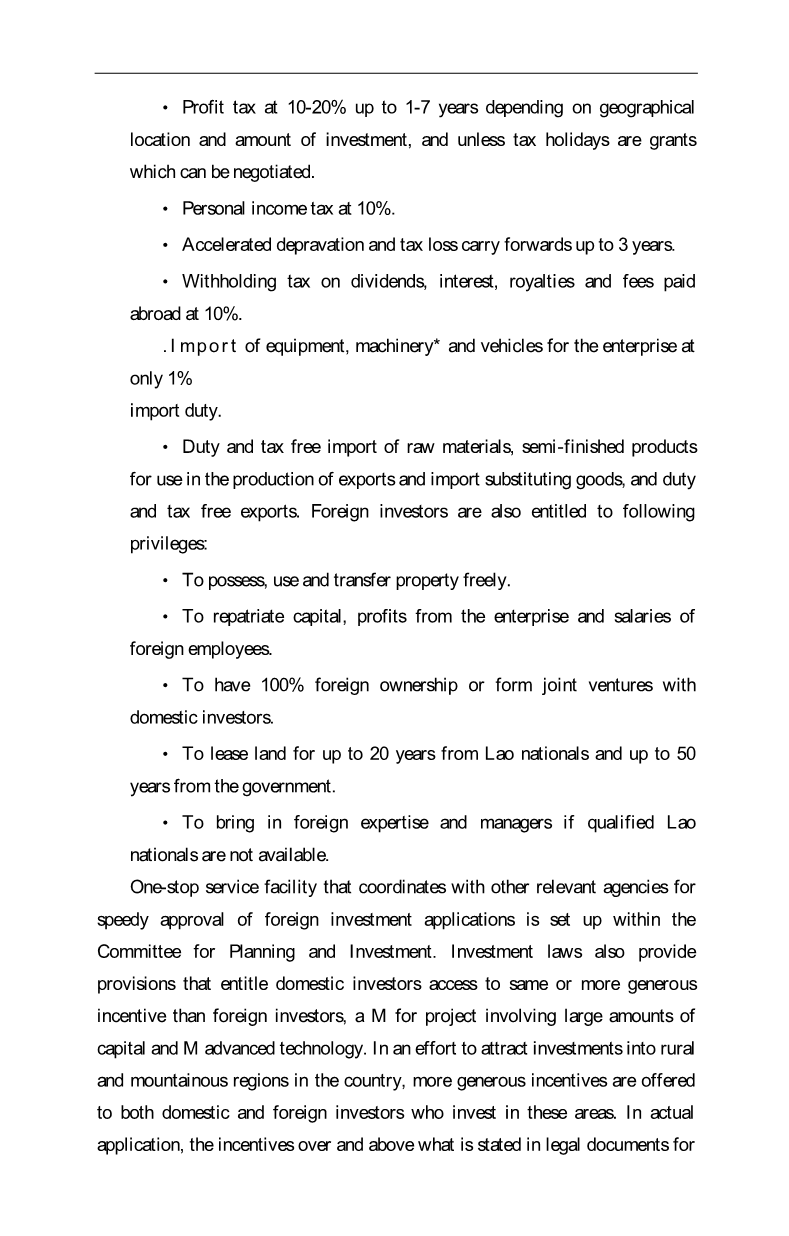 老挝政府认识到鼓励私营部门投资对市场经济发展的重要性。它热衷于吸引外国直接投资(FDI),尤其是作为克服资本和外汇短缺、促进技能和技术转让以及改善进入海外市场的途径。作为一项政策,在考虑国家安全的前提下,欢迎外国投资于经济的所有部门和国家的所有地区。同时,政府提供了多种形式的激励措施来鼓励国内投资者。然而,目前的投资政策制度似乎更重视对投资者的慷慨激励,而不是为投资者提供一个有利的环境,使其具有适当的宏观经济政策、透明有效的法律制度、发达的基础设施和技能发展等特征,这些特征将是必要的。竞争津贴。老挝政府认识到后一个领域的不足,并致力于解决这些不足,尽管迄今为止进展缓慢。当前的投资激励制度是在过去十年中由一系列连续的立法演变而来的。根据该制度,向外国投资者提供的激励措施包括: