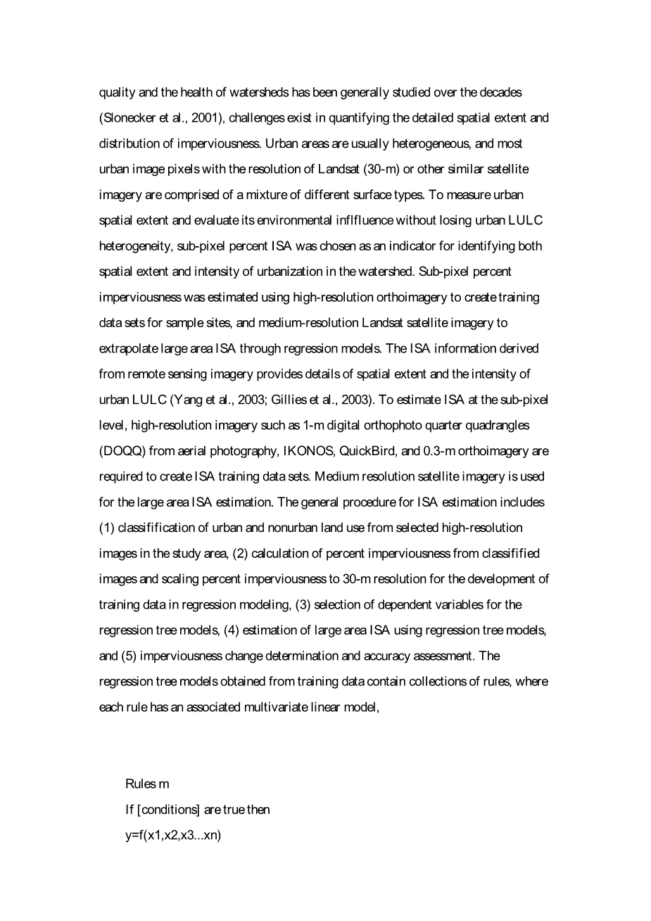 容纳该地区不断增长的人口需要提高对与城市增长趋势相关的环境条件的认识。虽然几十年来人们普遍研究了城市化,人口增长和不透水面覆盖对水质和流域健康的影响(Slonecker等,2001),但在量化不透水性的详细空间范围和分布方面存在挑战。城市区域通常是异质的,大多数具有Landsat(30米)或其他类似卫星图像分辨率的城市图像像素由不同表面类型的混合物组成。为了测量城市空间范围并评估其环境影响而不失去城市LULC异质性,选择亚像素百分比ISA作为识别流域城市化的空间范围和强度的指标。使用高分辨率正射影像估算亚像素百分比不透性以创建样本点的训练数据集,并使用中等分辨率Landsat卫星图像通过回归模型推断大面积ISA。来自遥感图像的ISA信息提供了空间范围和城市LULC强度的细节(Yang等,2003; Gillies等,2003)。为了在亚像素级别估计ISA,需要高分辨率图像,例如来自航空摄影的1-m数字正射影像四分之一四边形(DOQQ),IKONOS,QuickBird和0.3-m正射成像,以创建ISA训练数据集。中等分辨率卫星图像用于大面积ISA估计。 ISA估算的一般程序包括(1)从研究区域中选定的高分辨率图像中分类城市和非城市土地利用,(2)从分类图像中计算不透水性百分比,并将不透水度百分比调整为30米分辨率。在回归建模中开发训练数据,(3)回归树模型的因变量选择,(4)使用回归树模型估计大面积ISA,以及(5)不透性变化确定和准确性评估。从训练数据获得的回归树模型包含规则集合,其中每个规则具有关联的多元线性模型。