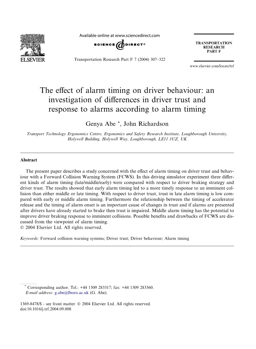 警报感知和驾驶员对警报的响应受潜在变量的影响,该变量一直是自动化系统中驾驶员信任的大量研究成果的主题。信任被认为是决定系统有效性的一个主要解释变量,包括人工操作和自动化过程。例如,Parasuraman和Riley(1997)发现信任与自动化系统的使用、废弃和误用高度相关。此外,人们发现,用户对自动化系统的信任在很大程度上决定了用户对该系统的行为(Itoh、Abe和Tanaka,1999;Lee和Kantowitz,1998;Lee和Moray,1992;Muir,1994)。他们的研究表明,驾驶员对警告系统的信任也有助于描述驾驶员对此类系统的行为。Abe、Itoh和Tanaka(2002年)发现,在一个使用带防撞系统的驾驶模拟器的实验中,真实的错误警报导致信任度降低和警报响应延迟。Gupta、Bisantz和Singh(2002)指出, 与低灵敏度报警系统相比,驾驶员对高灵敏度系统的信任可能会降低。这些结果表明,驾驶员对警报的信任通常反映了驾驶员对警报时间的感知以及随后驾驶员对警报的响应。然而,对于报警时间和驾驶员信任之间的实际关系知之甚少。因此,有必要了解警报时间如何影响驾驶员信任,以及信任如何影响驾驶员对报警系统的行为。